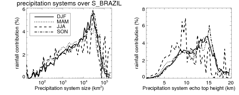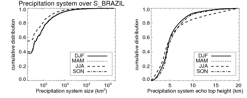 Over S_BRAZIL , mean size of precipitation system about 375.0 (km^2) and mean maximum radar echo top height of these precipitation systems is about 5.9 km. Following figure shows the cumulative distribution of the sizes and depths of the precipitation systems in different seasons: Though usually there are more small systems, the larger systems would bring more total precipitation. |