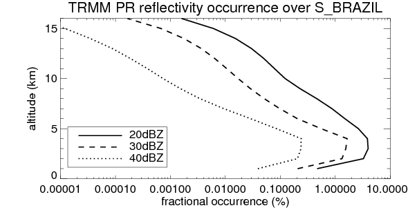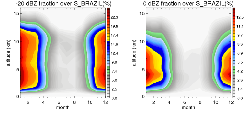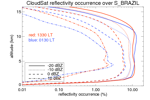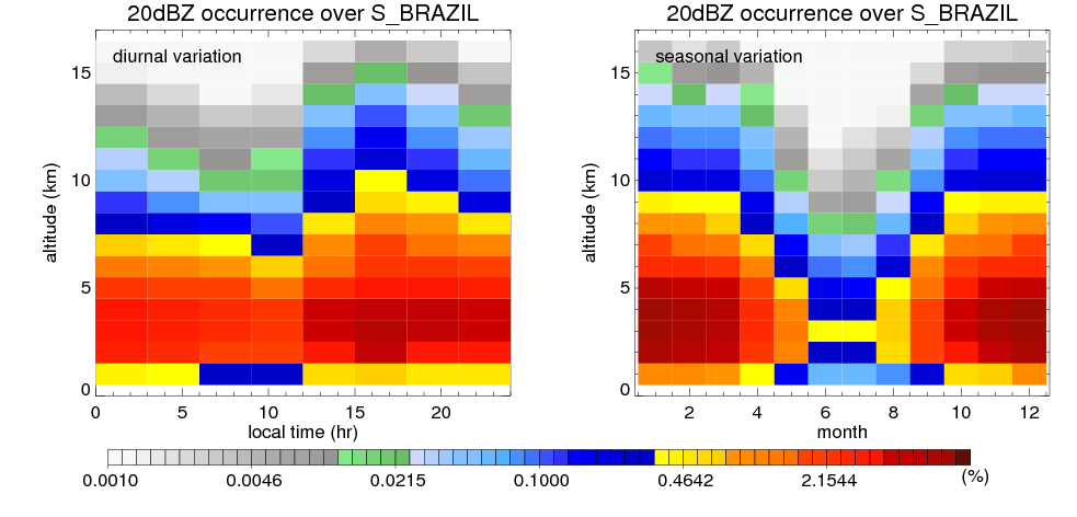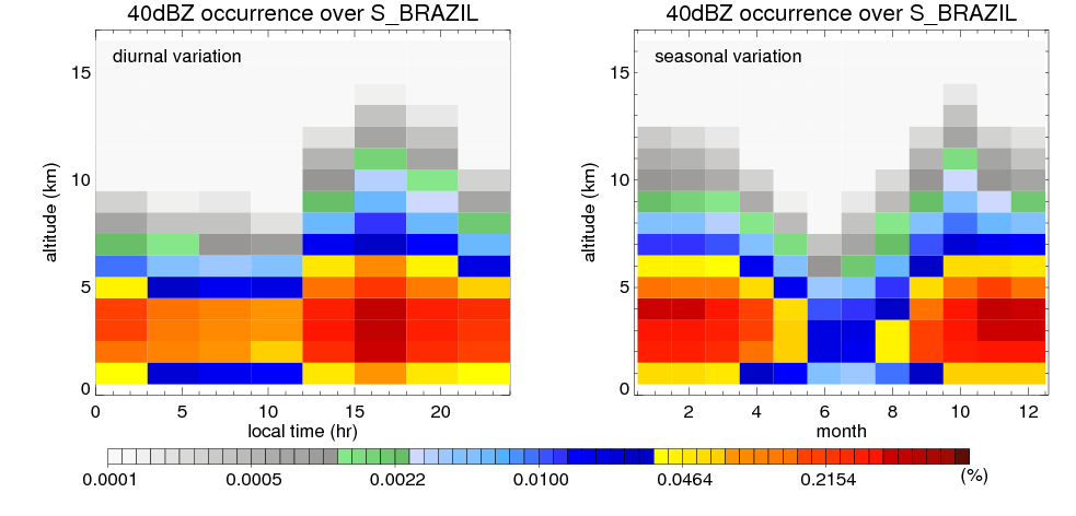 Here the precipitation means the precipitable hydrometeors (raindrops, snow flakes, graupel and hails) that detected by TRMM precipitation radar. Following figure shows the vertical profiles of 20, 30 and 40 dBZ fractional occurrence over S_BRAZIL in different seasons. The seasonal and diurnal variations of precipitation (20 dBZ) fractional occurrence at different altitudes are shown below: The seasonal and diurnal variations of INTENSIVE precipitation (40 dBZ) fractional occurrence at different altitudes are shown below: Clouds are consisted of small hydrometeors that undetectable by TRMM precipitation radar (Ku band). CloudSat (W band radar) provides the much great details of clouds. Following figure shows the vertical structure of the thin and thick clouds over S_BRAZIL. Note that high reflectivity at low levels are less frequent due to the attenuation. The seasonal variation of thin (-20 dBZ) and thick (0 dBZ) cloud over S_BRAZIL are shown below: |