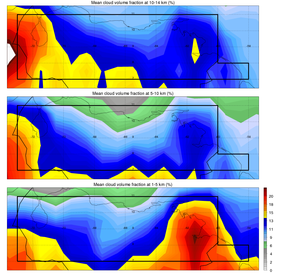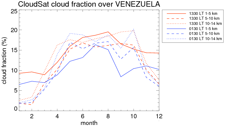 Over VENEZUELA , mean high level (10-14 km) cloud volume fraction is about 13.4%. Mean mid level (5-10 km) cloud volume fraction is about 11.2%. Mean low level (1-5 km) cloud volume fraction is about 13.0%. Seasonal and day vs. night variations of high, mid and low level cloud fraction over VENEZUELA are shown in following figure. You may check the details of cloud fraction in various seasons and at different local times. |