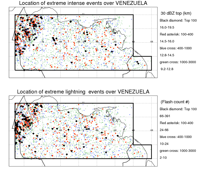 Following figure shows the location of the precipitation feautres categorized by the lightning rate and 30 dBZ echo top.
