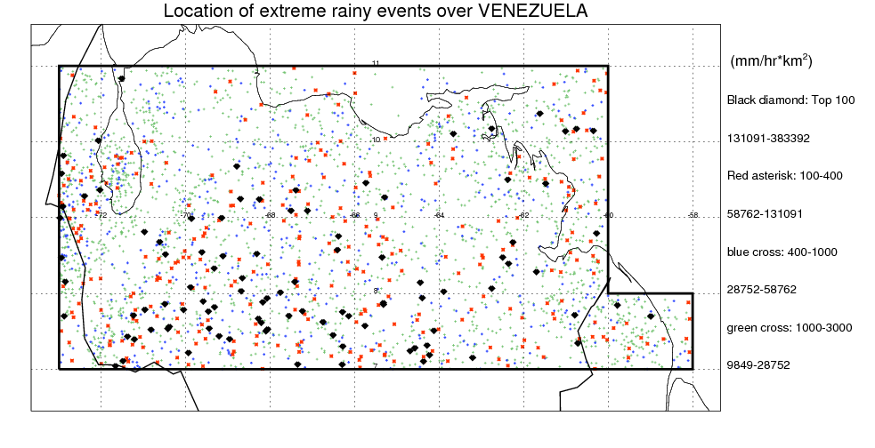 Following figure shows the location of the precipitation feautres categorized by the volumetric rainfall.