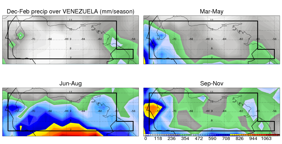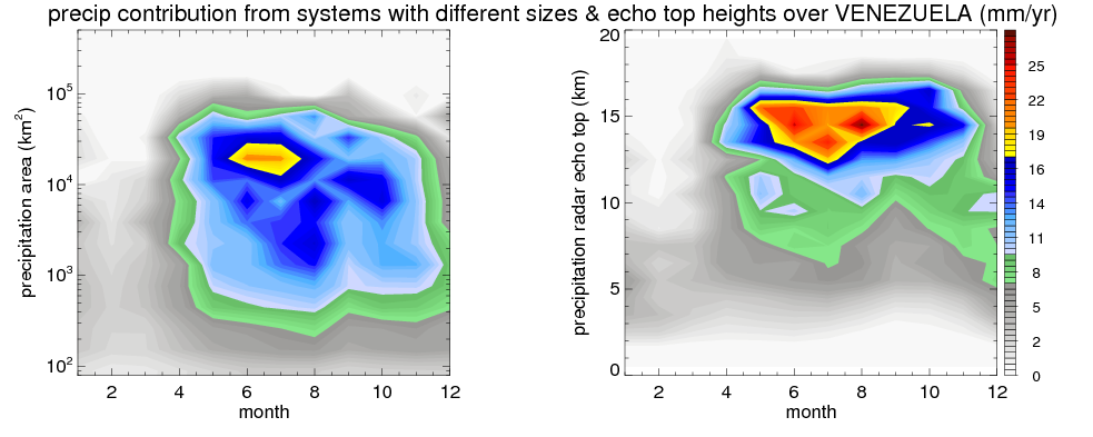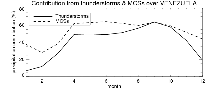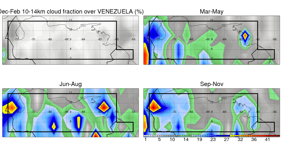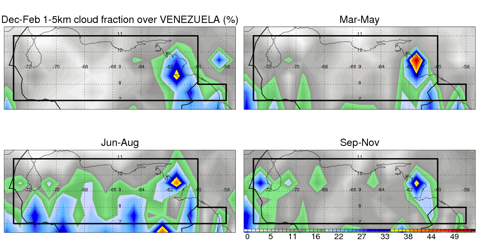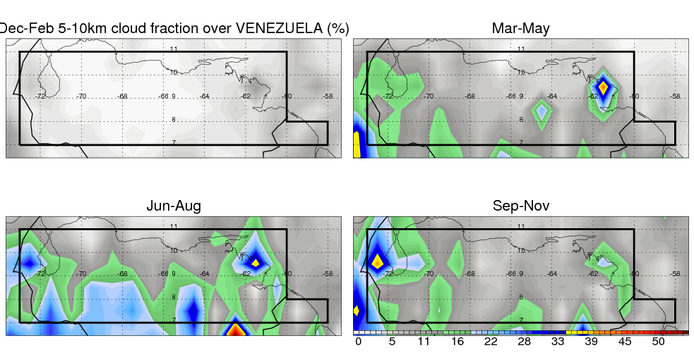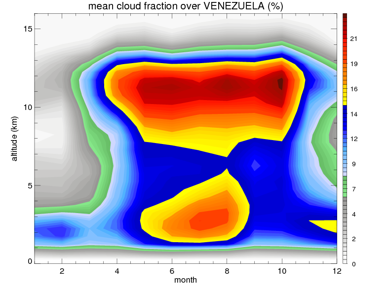 Over VENEZUELA , mean annual precipitation are estimated with 1326.1 (mm/year) from TRMM precipitation radar. (distribution of precipitation see here ) Total surface rainfall is brought by various precipitation systems. The seasonal variation of precipitation from systems with different sizes and heights are shown below: In total, thunderstorms (systems with detected lightning flashes) contribute 47 %, MCSs (Mesoscale convective systems with raining area > 2000 km^2) contribute 57 % of all precipitation. Seasonal variations of fraction of precipitation from thunderstorms and MCSs are shown below: The seasonal variation of geographical distribution of CloudSat cloud fraction over VENEZUELA is shown below: The seasonal variation of mean CloudSat level cloud fraction at different altitudes over VENEZUELA is shown below: |