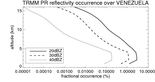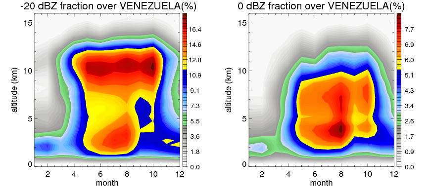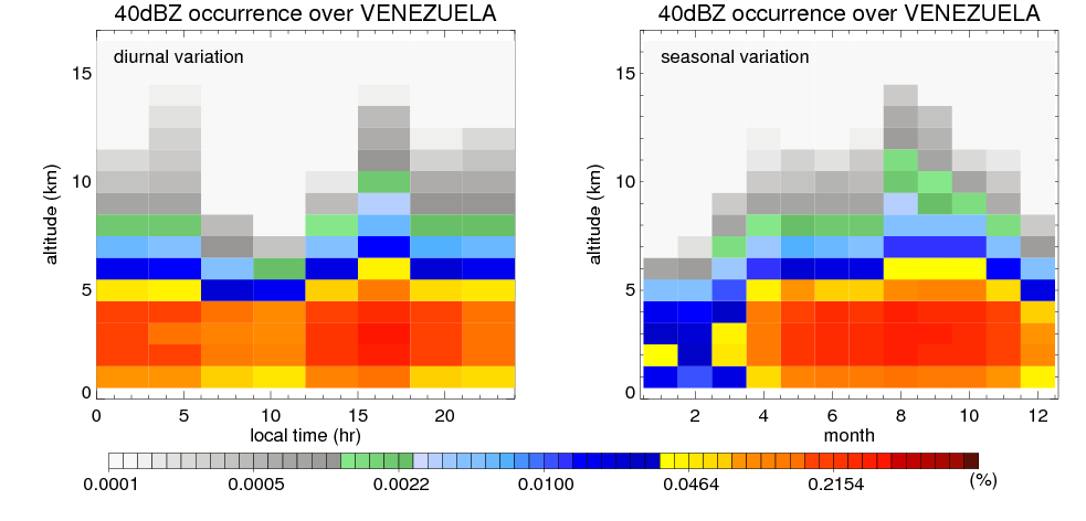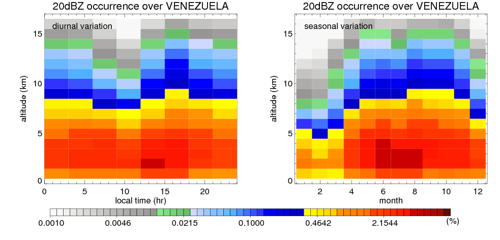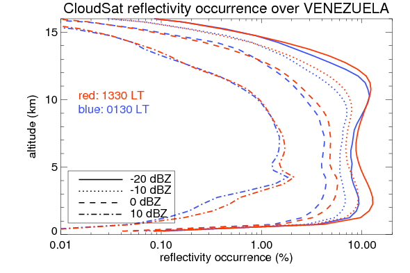 Here the precipitation means the precipitable hydrometeors (raindrops, snow flakes, graupel and hails) that detected by TRMM precipitation radar. Following figure shows the vertical profiles of 20, 30 and 40 dBZ fractional occurrence over VENEZUELA in different seasons. The seasonal and diurnal variations of precipitation (20 dBZ) fractional occurrence at different altitudes are shown below: The seasonal and diurnal variations of INTENSIVE precipitation (40 dBZ) fractional occurrence at different altitudes are shown below: Clouds are consisted of small hydrometeors that undetectable by TRMM precipitation radar (Ku band). CloudSat (W band radar) provides the much great details of clouds. Following figure shows the vertical structure of the thin and thick clouds over VENEZUELA. Note that high reflectivity at low levels are less frequent due to the attenuation. The seasonal variation of thin (-20 dBZ) and thick (0 dBZ) cloud over VENEZUELA are shown below: |