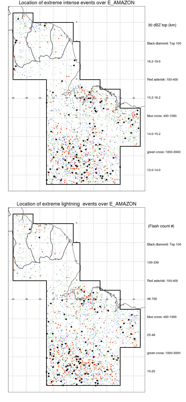 Following figure shows the location of the precipitation feautres categorized by the lightning rate and 30 dBZ echo top.