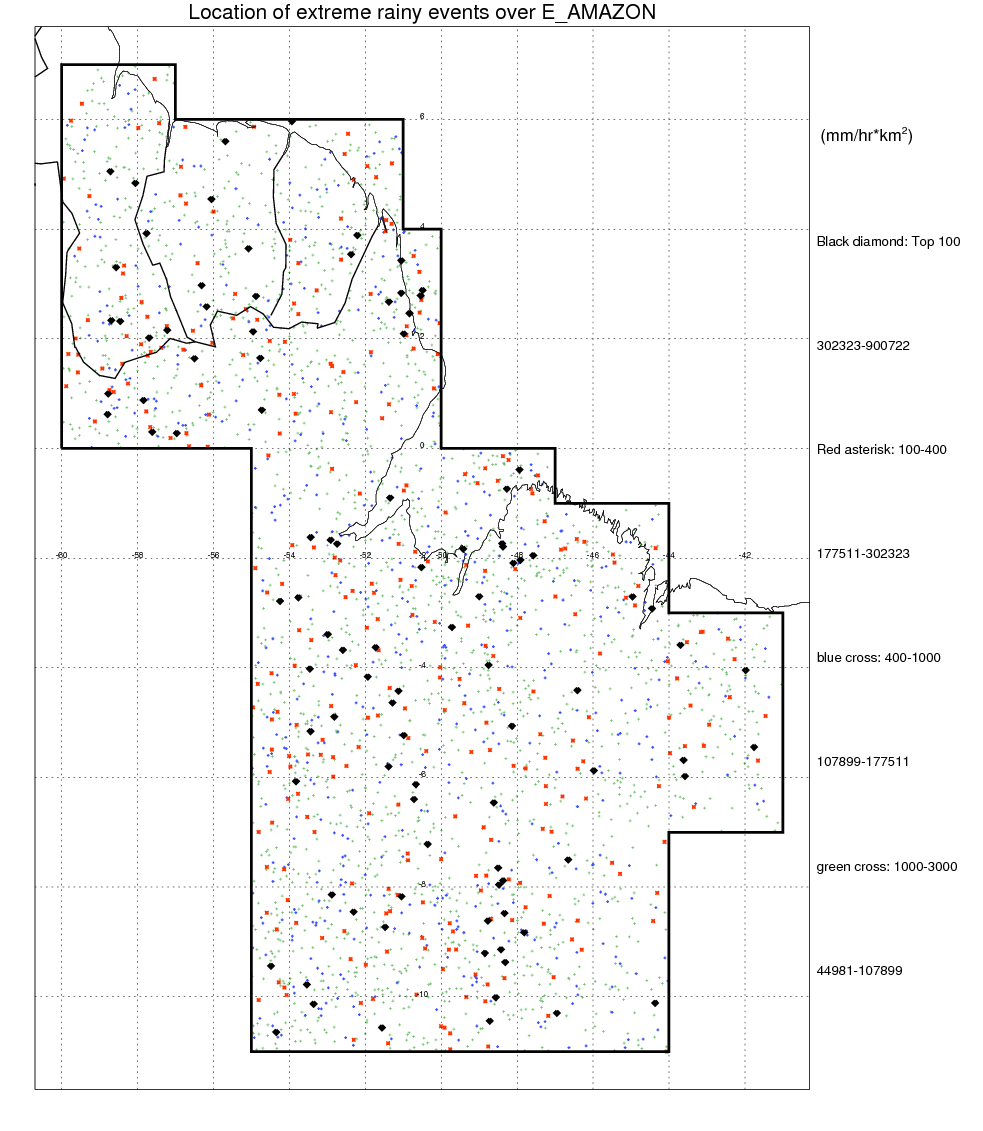 Following figure shows the location of the precipitation feautres categorized by the volumetric rainfall.