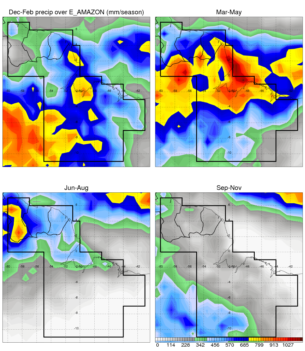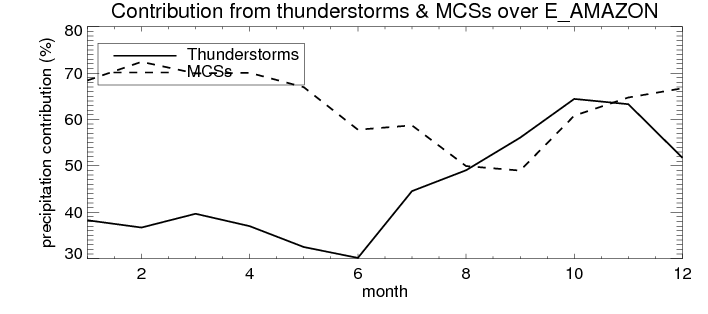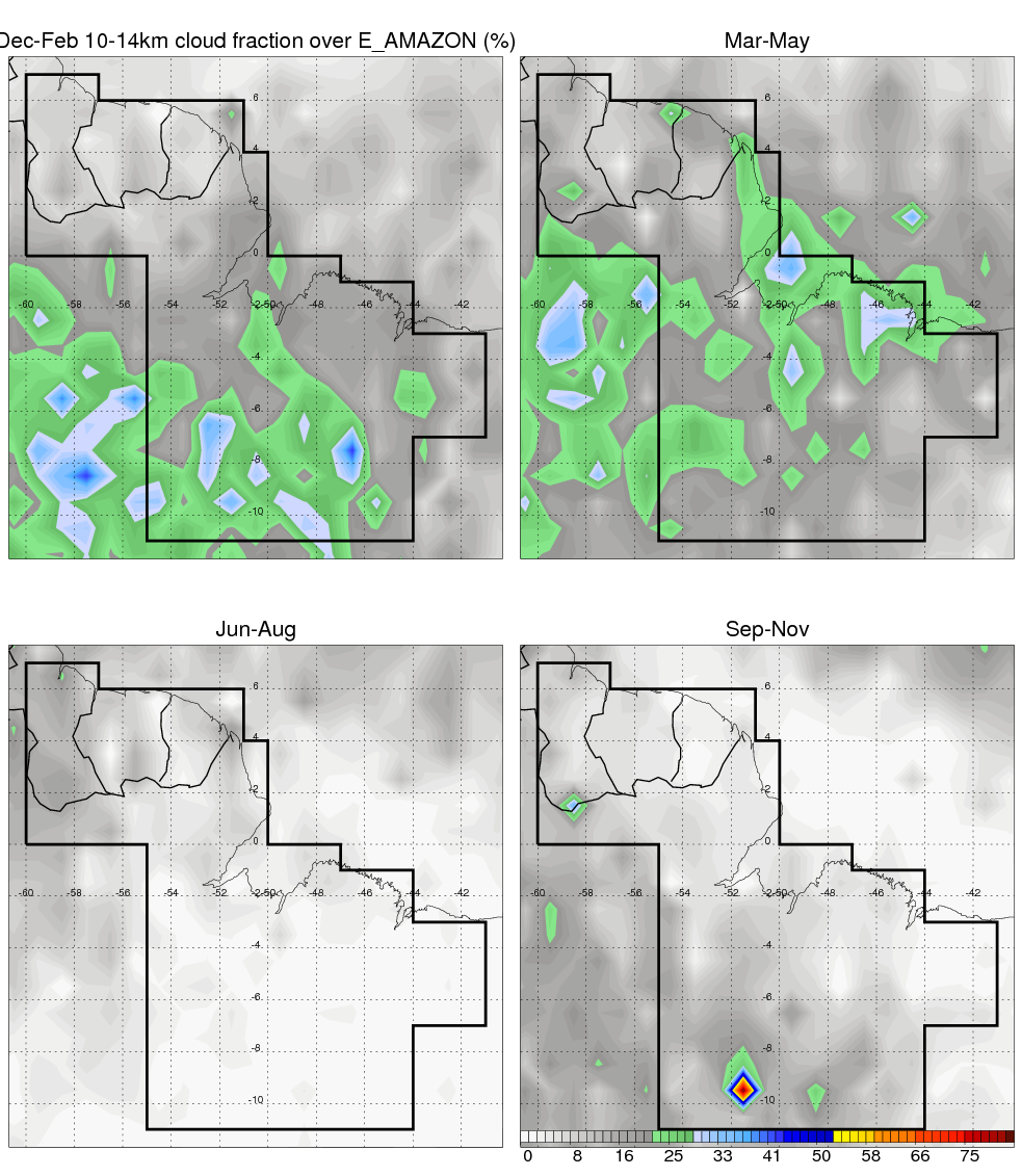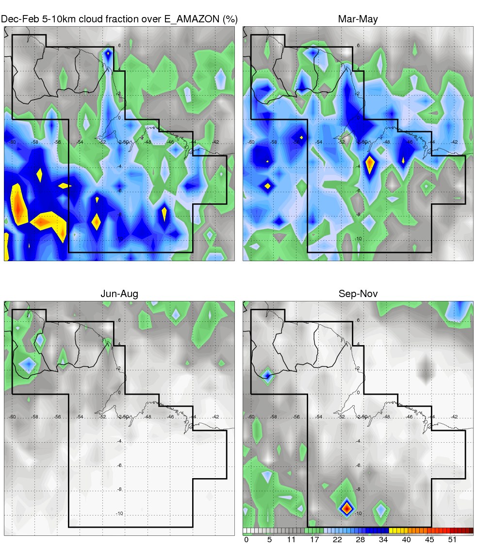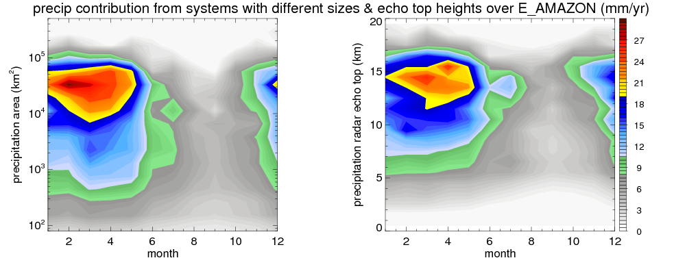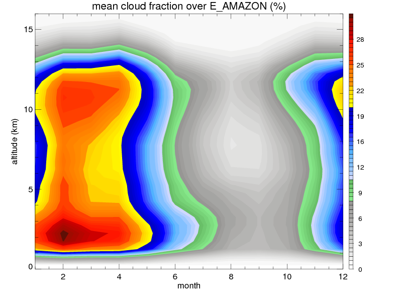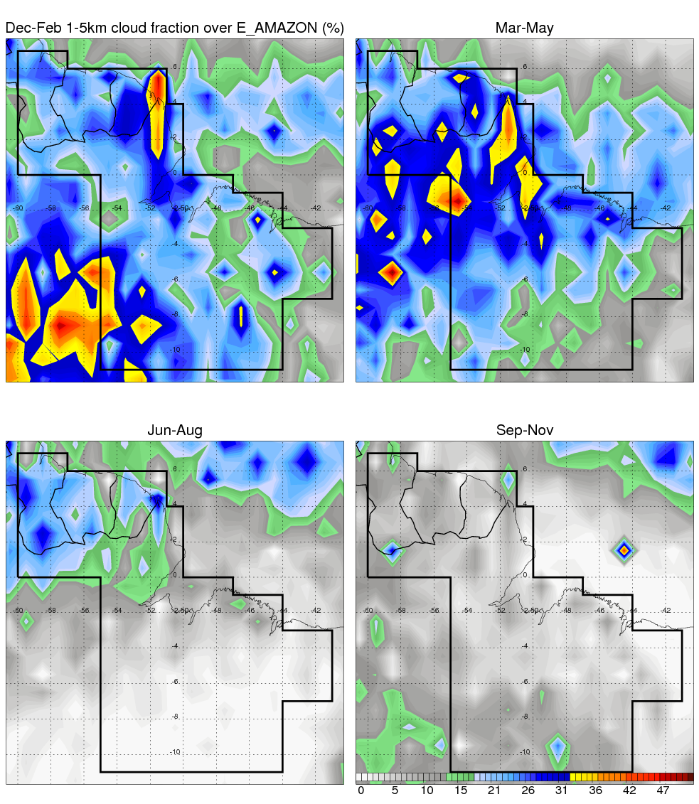 Over E_AMAZON , mean annual precipitation are estimated with 1671.6 (mm/year) from TRMM precipitation radar. (distribution of precipitation see here ) Total surface rainfall is brought by various precipitation systems. The seasonal variation of precipitation from systems with different sizes and heights are shown below: In total, thunderstorms (systems with detected lightning flashes) contribute 42 %, MCSs (Mesoscale convective systems with raining area > 2000 km^2) contribute 66 % of all precipitation. Seasonal variations of fraction of precipitation from thunderstorms and MCSs are shown below: The seasonal variation of geographical distribution of CloudSat cloud fraction over E_AMAZON is shown below: The seasonal variation of mean CloudSat level cloud fraction at different altitudes over E_AMAZON is shown below: |