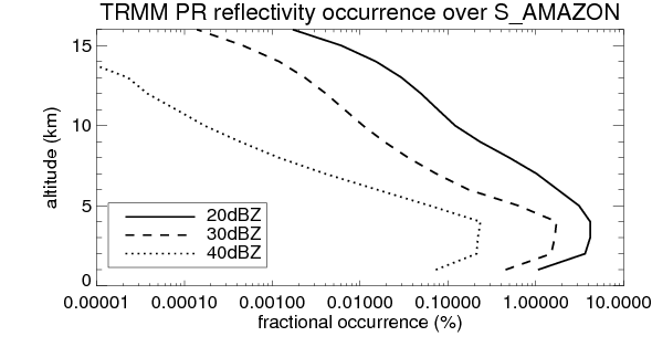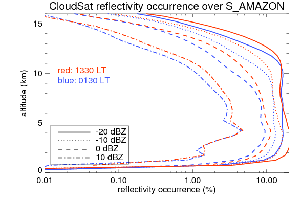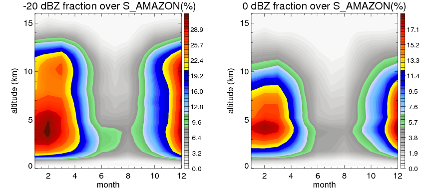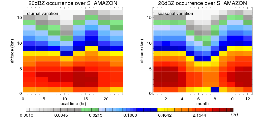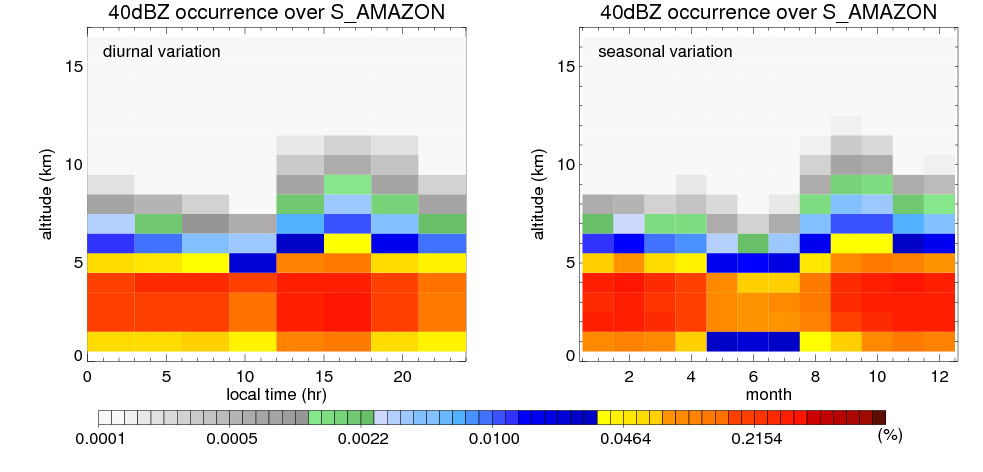 Here the precipitation means the precipitable hydrometeors (raindrops, snow flakes, graupel and hails) that detected by TRMM precipitation radar. Following figure shows the vertical profiles of 20, 30 and 40 dBZ fractional occurrence over S_AMAZON in different seasons. The seasonal and diurnal variations of precipitation (20 dBZ) fractional occurrence at different altitudes are shown below: The seasonal and diurnal variations of INTENSIVE precipitation (40 dBZ) fractional occurrence at different altitudes are shown below: Clouds are consisted of small hydrometeors that undetectable by TRMM precipitation radar (Ku band). CloudSat (W band radar) provides the much great details of clouds. Following figure shows the vertical structure of the thin and thick clouds over S_AMAZON. Note that high reflectivity at low levels are less frequent due to the attenuation. The seasonal variation of thin (-20 dBZ) and thick (0 dBZ) cloud over S_AMAZON are shown below: |