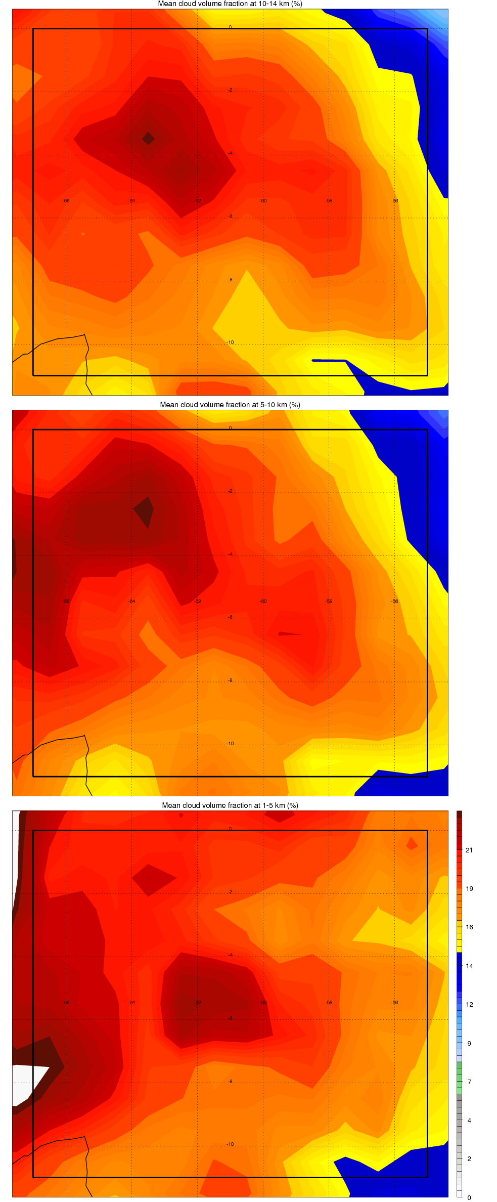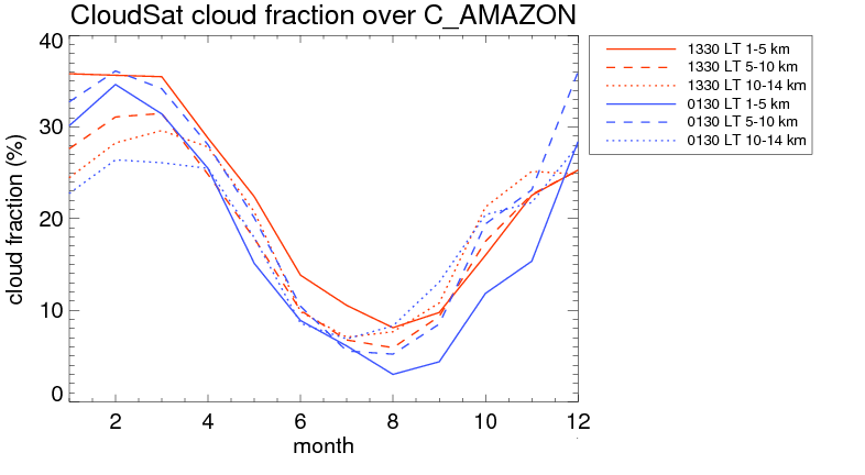 Over C_AMAZON , mean high level (10-14 km) cloud volume fraction is about 19.1%. Mean mid level (5-10 km) cloud volume fraction is about 19.6%. Mean low level (1-5 km) cloud volume fraction is about 19.8%. Seasonal and day vs. night variations of high, mid and low level cloud fraction over C_AMAZON are shown in following figure. You may check the details of cloud fraction in various seasons and at different local times. |