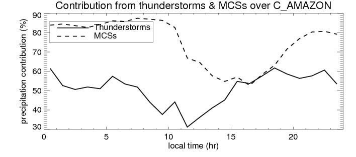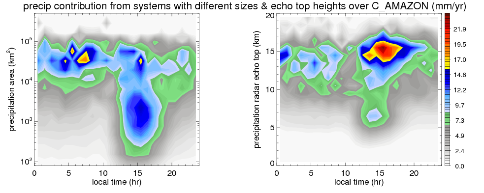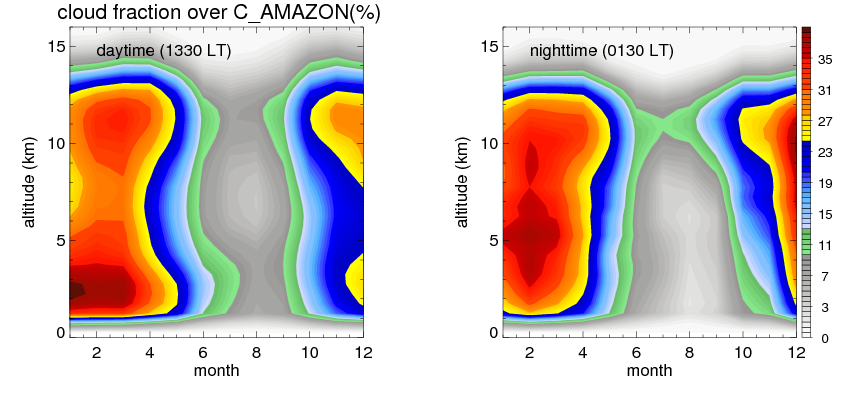 Many studies suggested that the diurnal variation of the precipitation is related to the life cycles of the precipitation systems, which is frequently driven by the surface sensible heating. Over C_AMAZON, mean annual precipitation are estimated with 2123.4 (mm/year) from precipitation radar. Detailed diurnal variation of the precipitation at high resolution can be accessed here (NOTE: it may take long time to generate for a large area). The diurnal variation of precipitation from systems with different sizes and heights are shown below: In total, thunderstorms (systems with detected lightning flashes) contribute 50 %, MCSs (Mesoscale convective systems with raining area > 2000 km^2) contribute 71 % of all precipitation over C_AMAZON. Diurnal variations of fraction of precipitation from thunderstorms and MCSs over C_AMAZON are shown below: Certainly there is a strong diurnal variation of different types of clouds. Because CloudSat observes at 0130 and 1330 local time, here the daytime and night cloud fraction in different seasons are presented: |