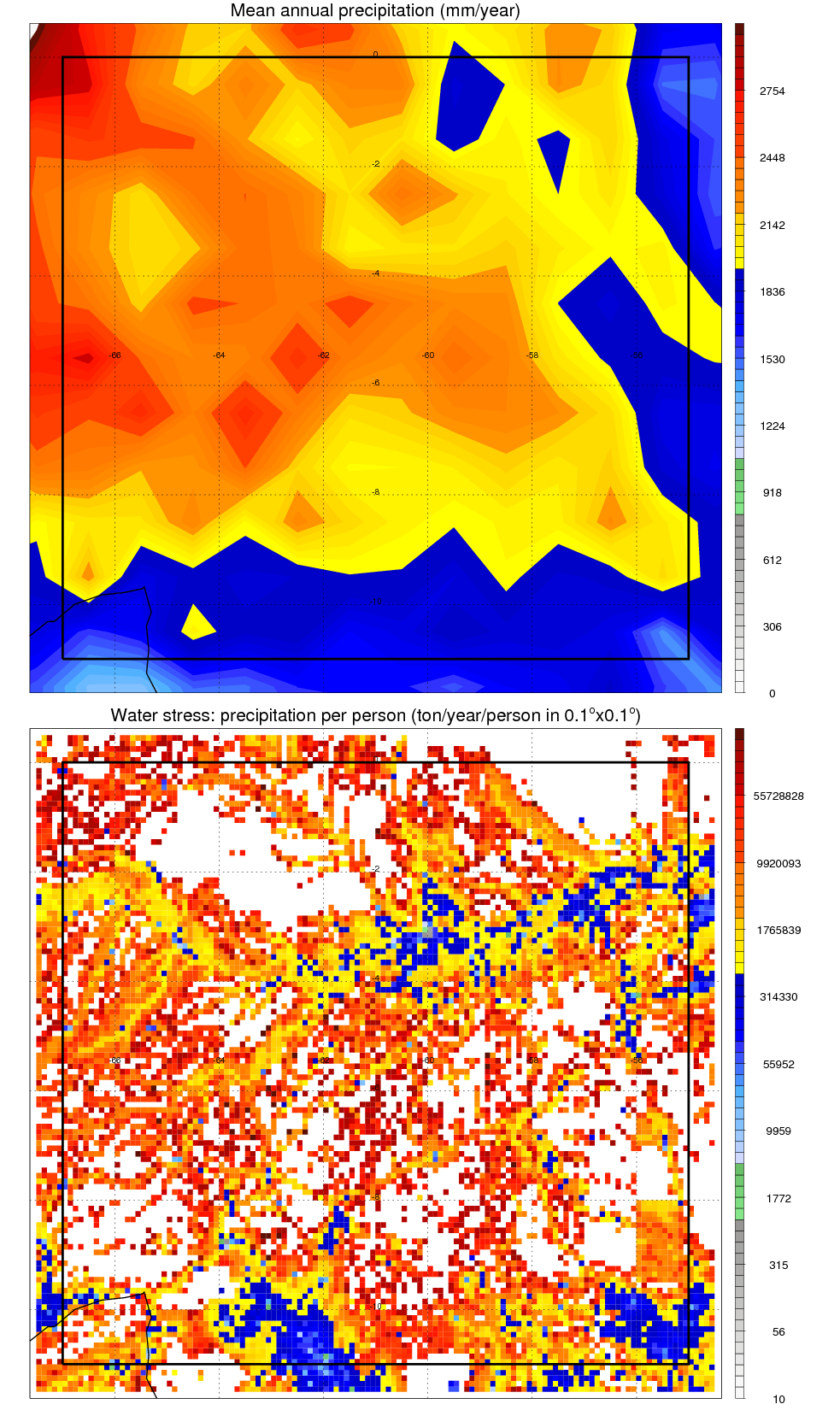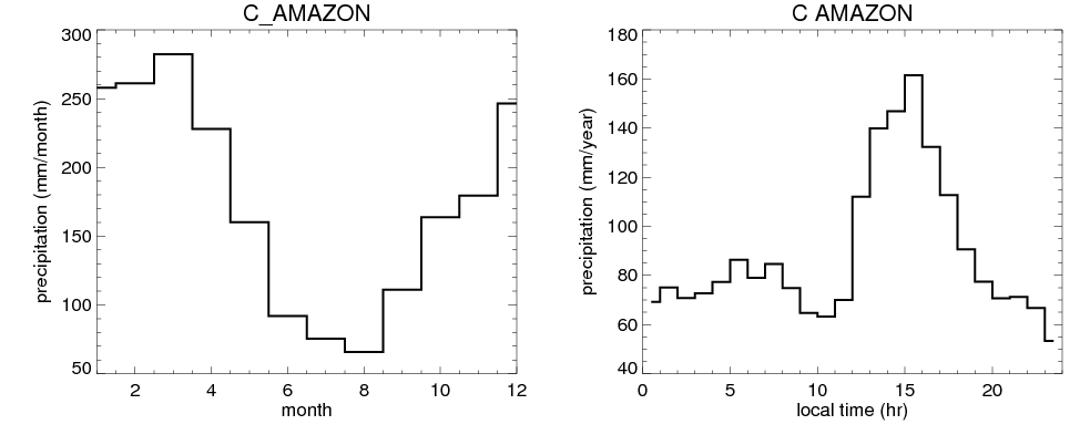Over C_AMAZON , mean annual precipitation are estimated with 2123.4 (mm/year) from precipitation radar, and 2033.4 (mm/year) from microwave radiometer observations. (see high resolution precipitation product , NOTE: it may take long time to generate for large area) In total, thunderstorms (systems with detected lightning flashes) contribute 50 %, MCSs (Mesoscale convective systems with raining area > 2000 km^2) contribute 71 % of all precipitation. Seasonal and diurnal variations of rainfall over C_AMAZON are shown in following figure. You may check the details of rainfall contributions from precipitation systems with different sizes and intensities in various seasons and at different local times. |