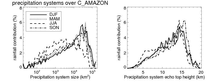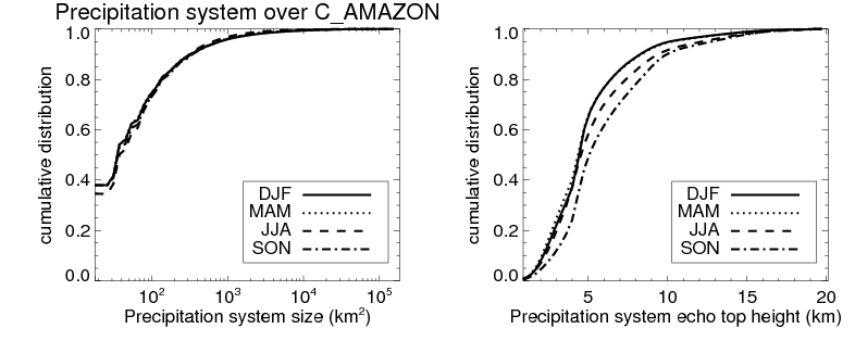 Over C_AMAZON , mean size of precipitation system about 348.9 (km^2) and mean maximum radar echo top height of these precipitation systems is about 5.6 km. Following figure shows the cumulative distribution of the sizes and depths of the precipitation systems in different seasons: Though usually there are more small systems, the larger systems would bring more total precipitation. |