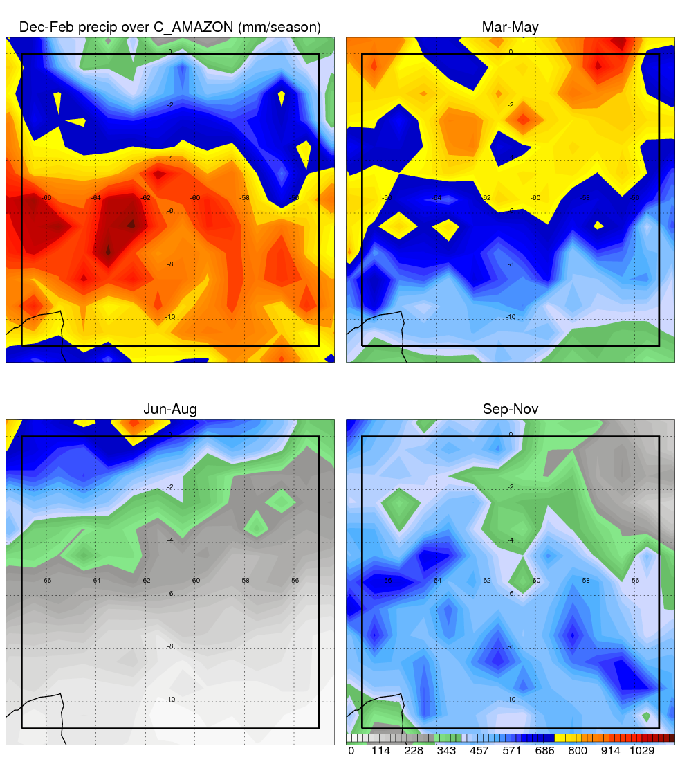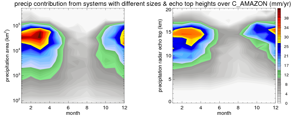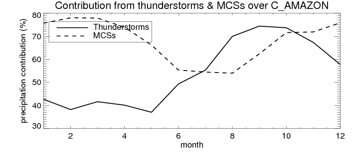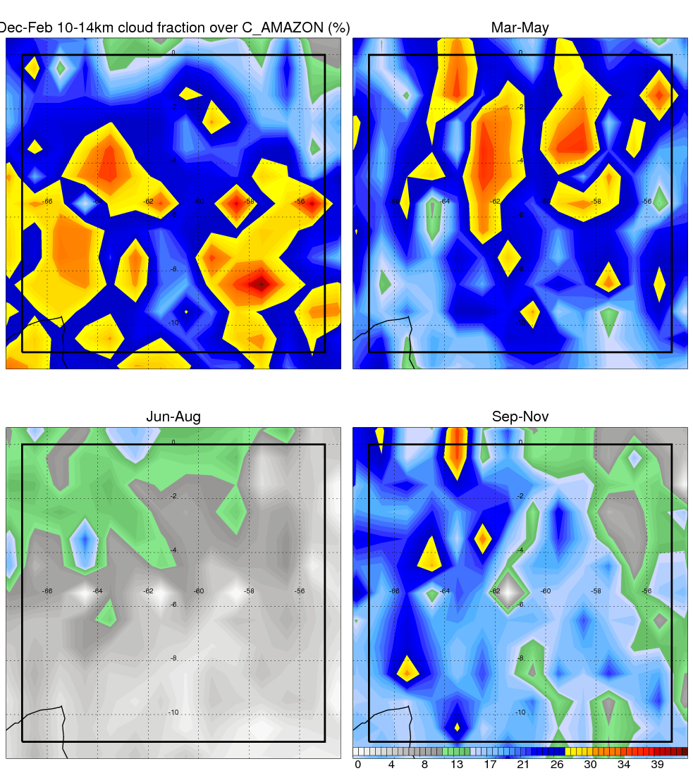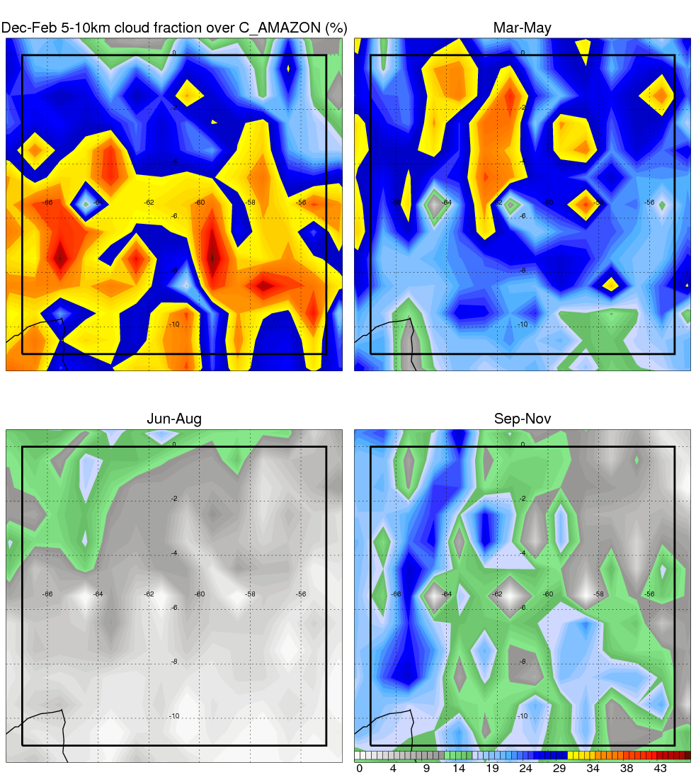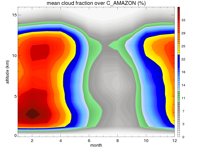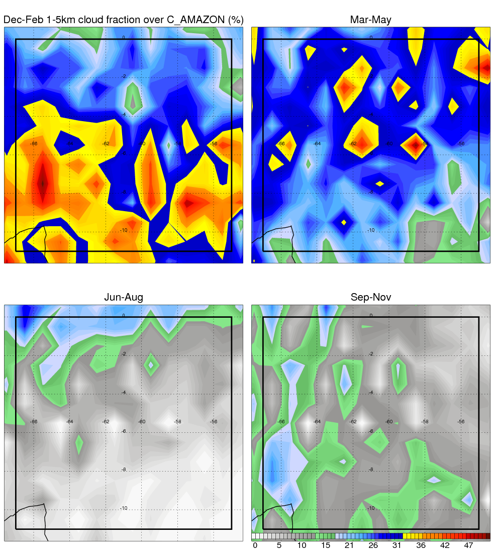 Over C_AMAZON , mean annual precipitation are estimated with 2123.4 (mm/year) from TRMM precipitation radar. (distribution of precipitation see here ) Total surface rainfall is brought by various precipitation systems. The seasonal variation of precipitation from systems with different sizes and heights are shown below: In total, thunderstorms (systems with detected lightning flashes) contribute 50 %, MCSs (Mesoscale convective systems with raining area > 2000 km^2) contribute 71 % of all precipitation. Seasonal variations of fraction of precipitation from thunderstorms and MCSs are shown below: The seasonal variation of geographical distribution of CloudSat cloud fraction over C_AMAZON is shown below: The seasonal variation of mean CloudSat level cloud fraction at different altitudes over C_AMAZON is shown below: |