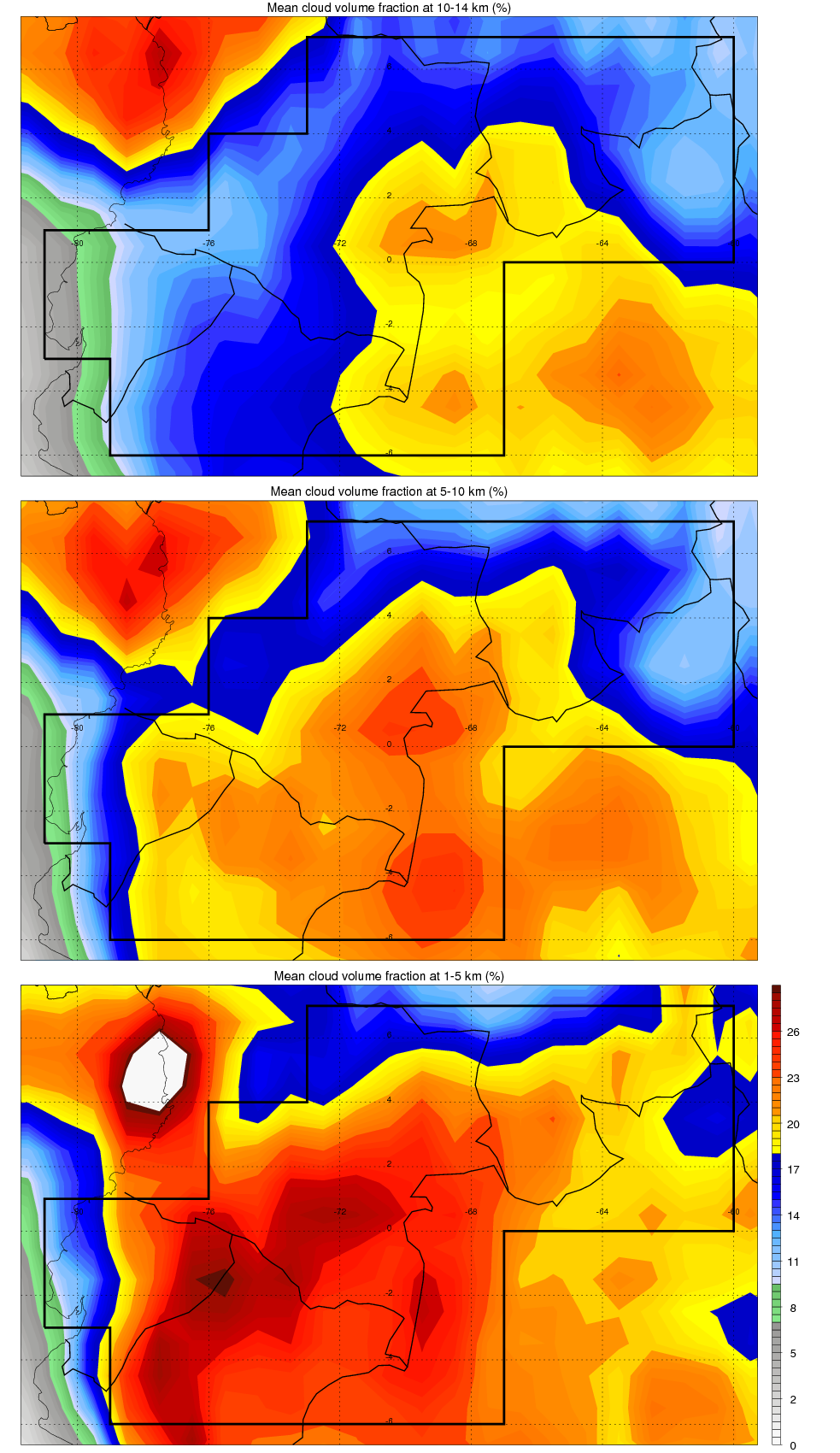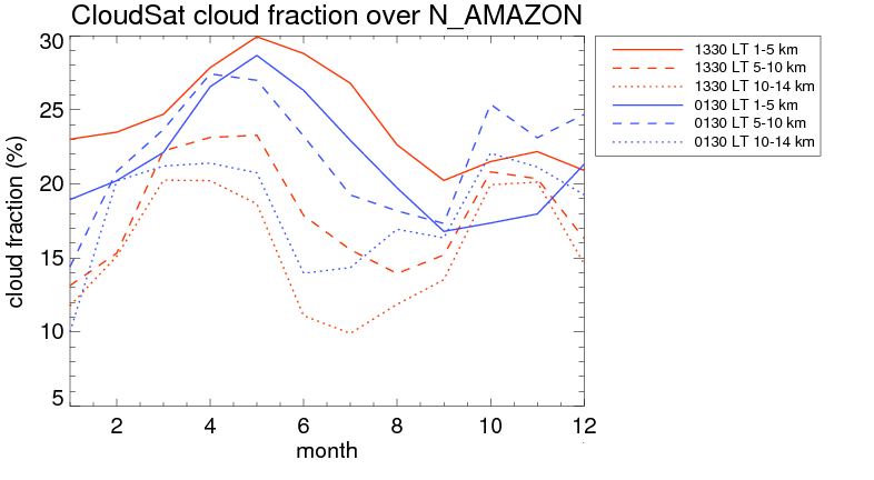 Over N_AMAZON , mean high level (10-14 km) cloud volume fraction is about 16.7%. Mean mid level (5-10 km) cloud volume fraction is about 19.6%. Mean low level (1-5 km) cloud volume fraction is about 23.1%. Seasonal and day vs. night variations of high, mid and low level cloud fraction over N_AMAZON are shown in following figure. You may check the details of cloud fraction in various seasons and at different local times. |