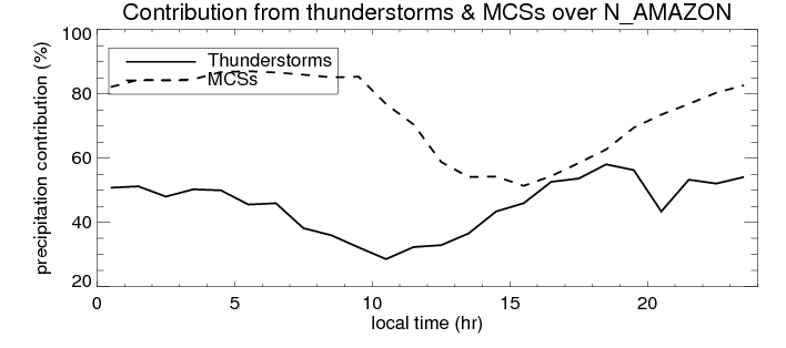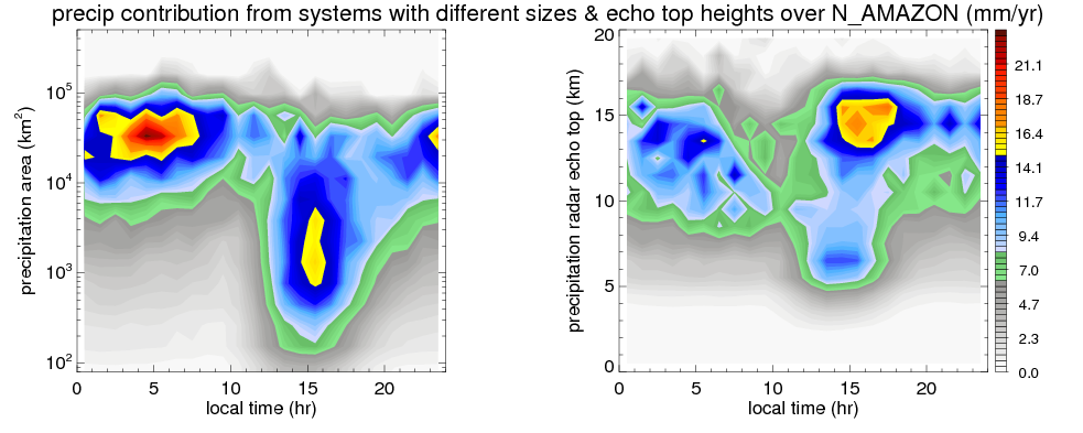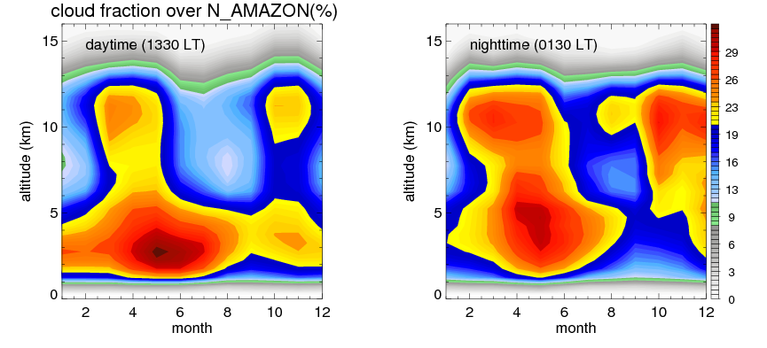 Many studies suggested that the diurnal variation of the precipitation is related to the life cycles of the precipitation systems, which is frequently driven by the surface sensible heating. Over N_AMAZON, mean annual precipitation are estimated with 2420.7 (mm/year) from precipitation radar. Detailed diurnal variation of the precipitation at high resolution can be accessed here (NOTE: it may take long time to generate for a large area). The diurnal variation of precipitation from systems with different sizes and heights are shown below: In total, thunderstorms (systems with detected lightning flashes) contribute 45 %, MCSs (Mesoscale convective systems with raining area > 2000 km^2) contribute 71 % of all precipitation over N_AMAZON. Diurnal variations of fraction of precipitation from thunderstorms and MCSs over N_AMAZON are shown below: Certainly there is a strong diurnal variation of different types of clouds. Because CloudSat observes at 0130 and 1330 local time, here the daytime and night cloud fraction in different seasons are presented: |