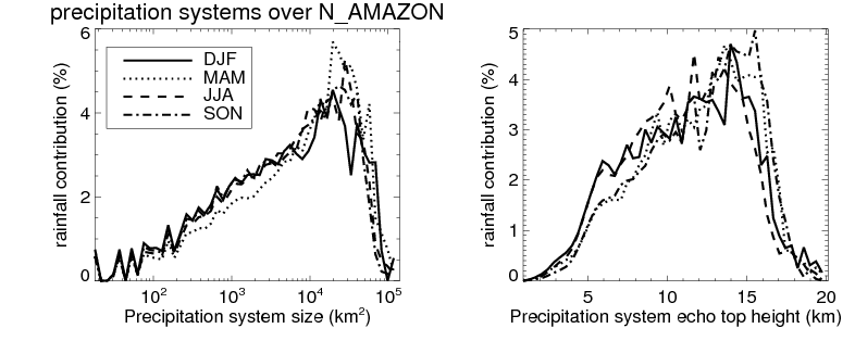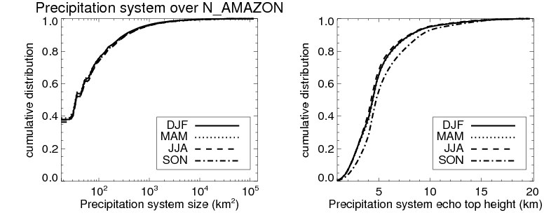Over N_AMAZON , mean size of precipitation system about 348.2 (km^2) and mean maximum radar echo top height of these precipitation systems is about 5.4 km. Following figure shows the cumulative distribution of the sizes and depths of the precipitation systems in different seasons: Though usually there are more small systems, the larger systems would bring more total precipitation. |