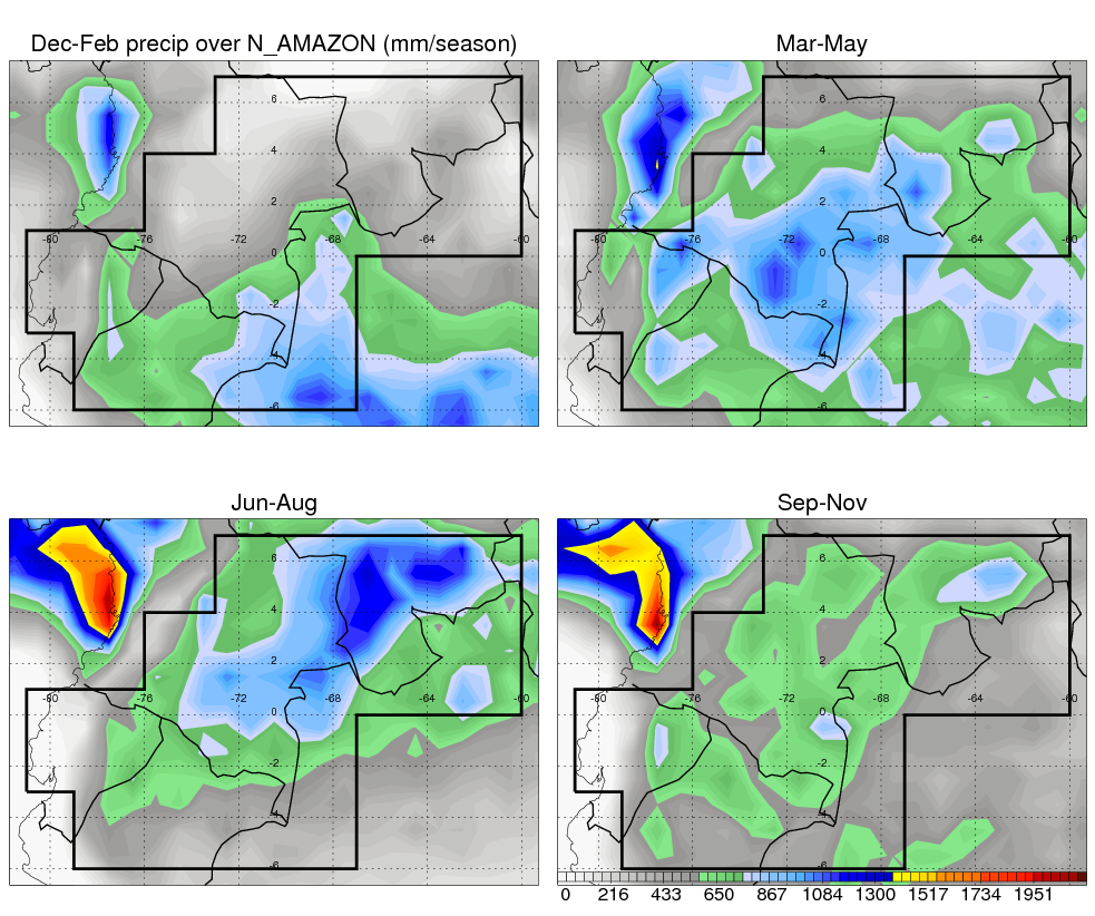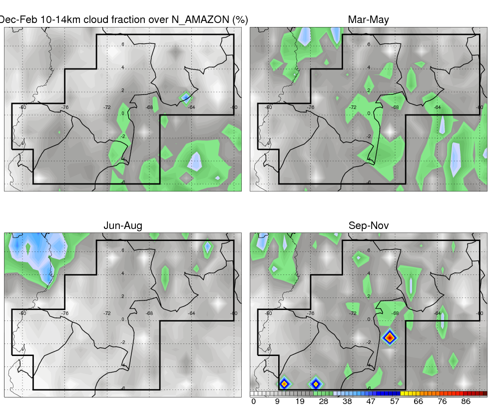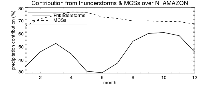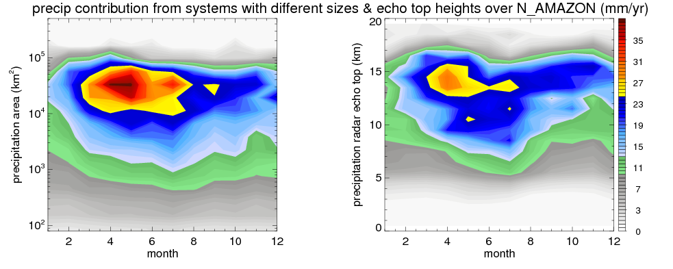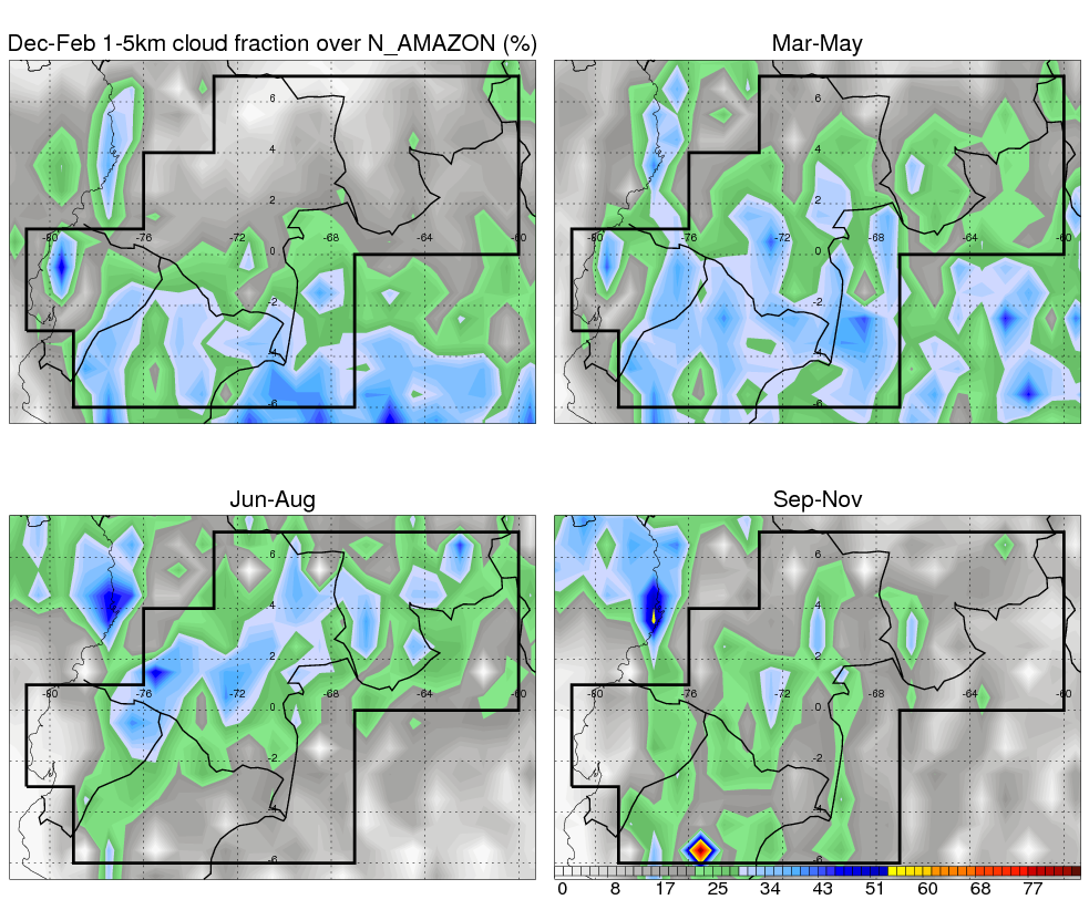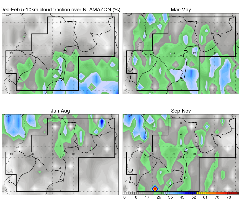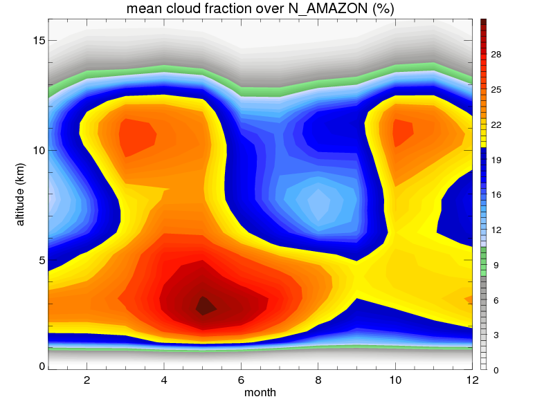 Over N_AMAZON , mean annual precipitation are estimated with 2420.7 (mm/year) from TRMM precipitation radar. (distribution of precipitation see here ) Total surface rainfall is brought by various precipitation systems. The seasonal variation of precipitation from systems with different sizes and heights are shown below: In total, thunderstorms (systems with detected lightning flashes) contribute 45 %, MCSs (Mesoscale convective systems with raining area > 2000 km^2) contribute 71 % of all precipitation. Seasonal variations of fraction of precipitation from thunderstorms and MCSs are shown below: The seasonal variation of geographical distribution of CloudSat cloud fraction over N_AMAZON is shown below: The seasonal variation of mean CloudSat level cloud fraction at different altitudes over N_AMAZON is shown below: |