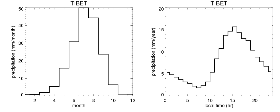 Over TIBET , mean annual precipitation are estimated with 182.2 (mm/year) from precipitation radar, and 1113.6 (mm/year) from microwave radiometer observations. (see high resolution precipitation product , NOTE: it may take long time to generate for large area) In total, thunderstorms (systems with detected lightning flashes) contribute 31 %, MCSs (Mesoscale convective systems with raining area > 2000 km^2) contribute 34 % of all precipitation. Seasonal and diurnal variations of rainfall over TIBET are shown in following figure. You may check the details of rainfall contributions from precipitation systems with different sizes and intensities in various seasons and at different local times. |