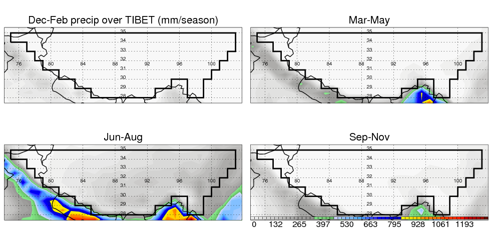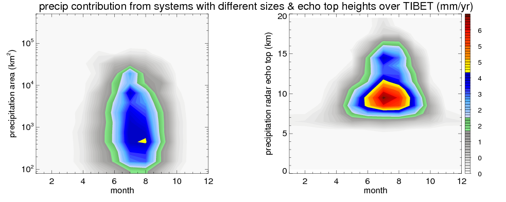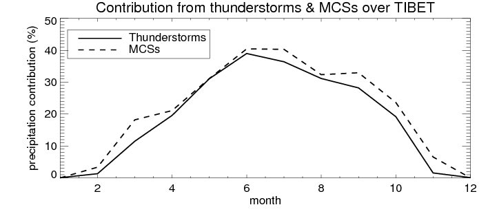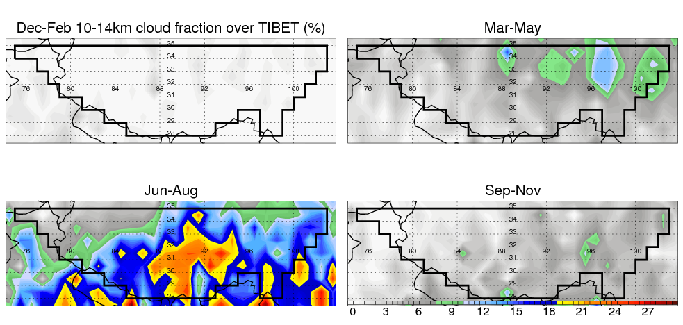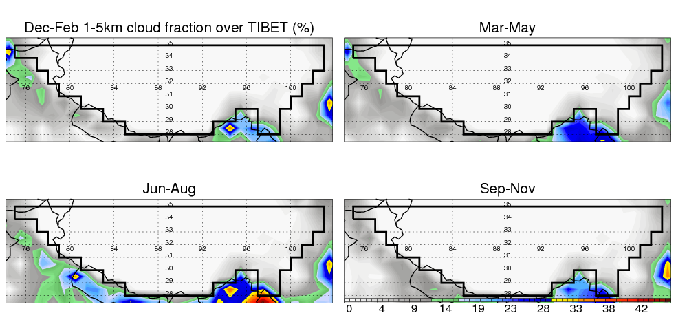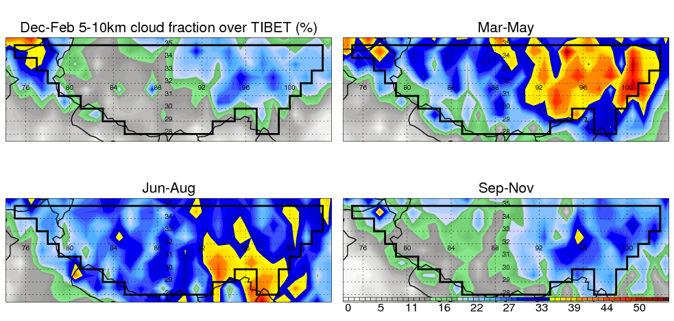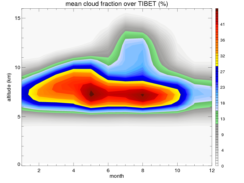 Over TIBET , mean annual precipitation are estimated with 182.2 (mm/year) from TRMM precipitation radar. (distribution of precipitation see here ) Total surface rainfall is brought by various precipitation systems. The seasonal variation of precipitation from systems with different sizes and heights are shown below: In total, thunderstorms (systems with detected lightning flashes) contribute 31 %, MCSs (Mesoscale convective systems with raining area > 2000 km^2) contribute 34 % of all precipitation. Seasonal variations of fraction of precipitation from thunderstorms and MCSs are shown below: The seasonal variation of geographical distribution of CloudSat cloud fraction over TIBET is shown below: The seasonal variation of mean CloudSat level cloud fraction at different altitudes over TIBET is shown below: |