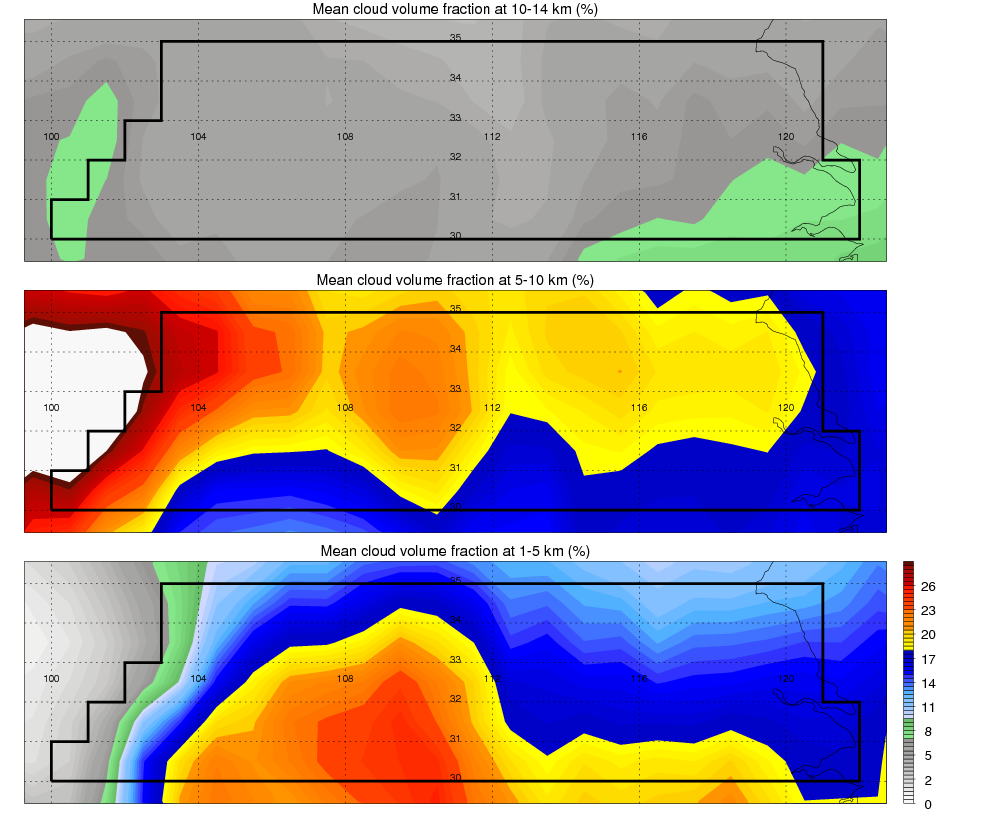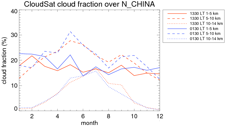 Over N_CHINA , mean high level (10-14 km) cloud volume fraction is about 6.7%. Mean mid level (5-10 km) cloud volume fraction is about 20.4%. Mean low level (1-5 km) cloud volume fraction is about 17.1%. Seasonal and day vs. night variations of high, mid and low level cloud fraction over N_CHINA are shown in following figure. You may check the details of cloud fraction in various seasons and at different local times. |