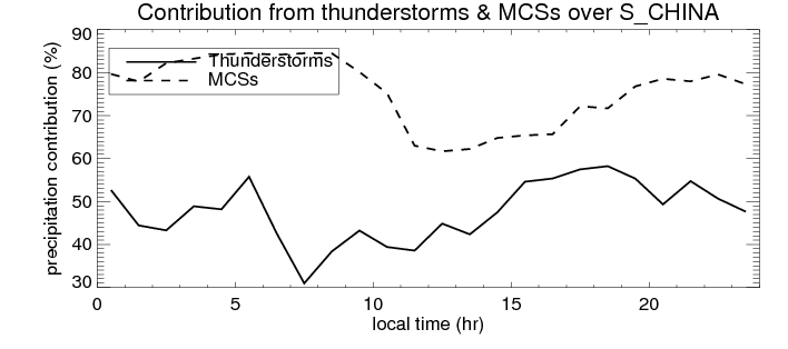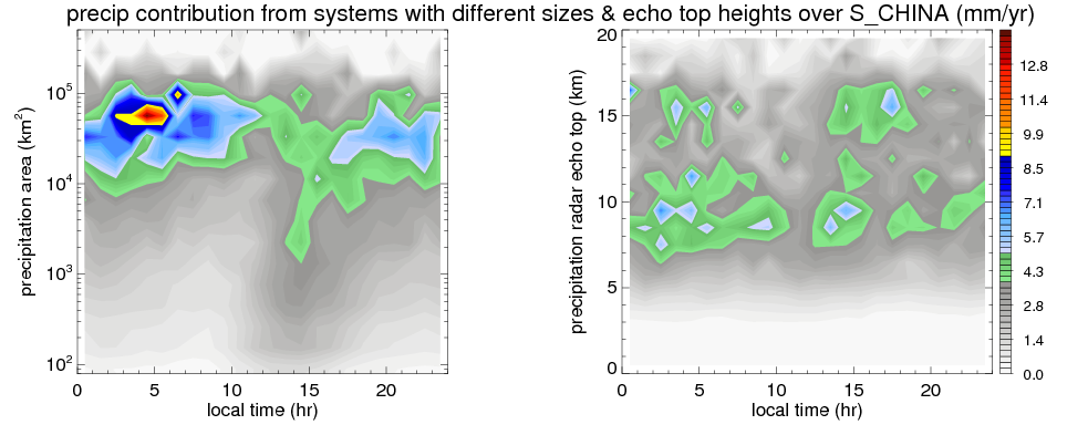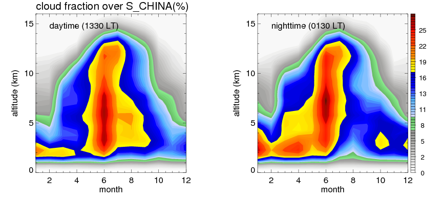 Many studies suggested that the diurnal variation of the precipitation is related to the life cycles of the precipitation systems, which is frequently driven by the surface sensible heating. Over S_CHINA, mean annual precipitation are estimated with 1077.8 (mm/year) from precipitation radar. Detailed diurnal variation of the precipitation at high resolution can be accessed here (NOTE: it may take long time to generate for a large area). The diurnal variation of precipitation from systems with different sizes and heights are shown below: In total, thunderstorms (systems with detected lightning flashes) contribute 47 %, MCSs (Mesoscale convective systems with raining area > 2000 km^2) contribute 75 % of all precipitation over S_CHINA. Diurnal variations of fraction of precipitation from thunderstorms and MCSs over S_CHINA are shown below: Certainly there is a strong diurnal variation of different types of clouds. Because CloudSat observes at 0130 and 1330 local time, here the daytime and night cloud fraction in different seasons are presented: |