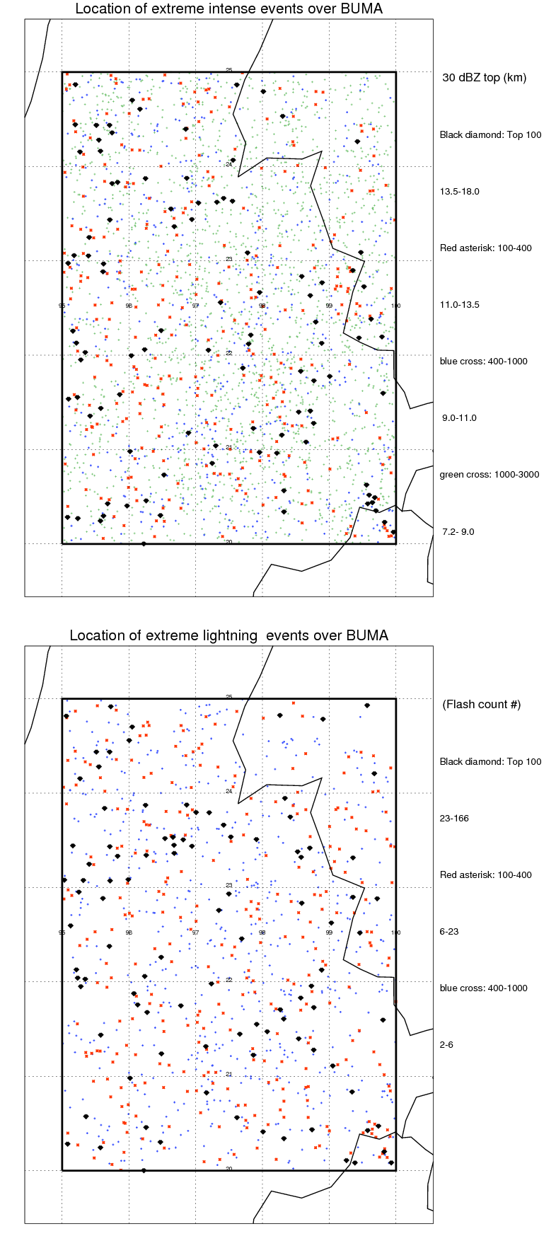 Following figure shows the location of the precipitation feautres categorized by the lightning rate and 30 dBZ echo top.