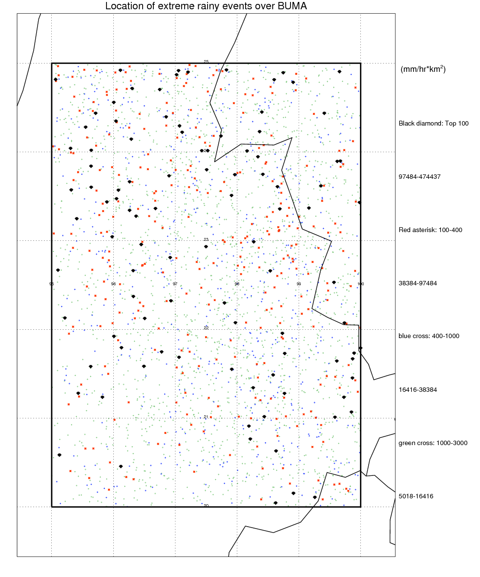 Following figure shows the location of the precipitation feautres categorized by the volumetric rainfall.