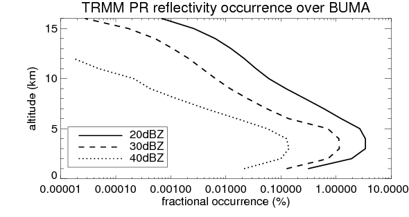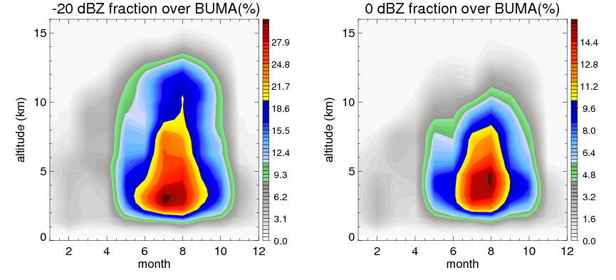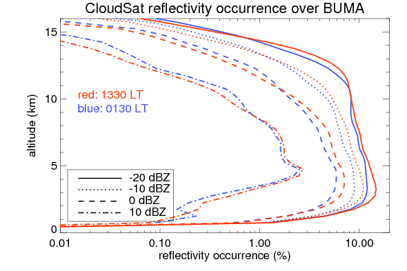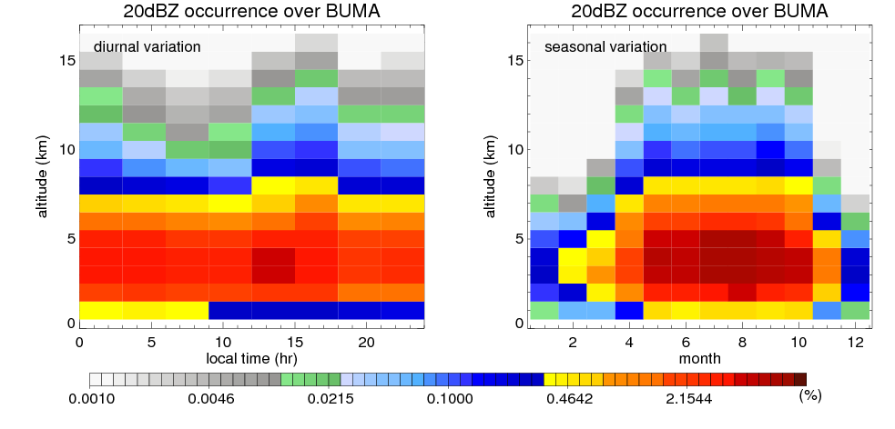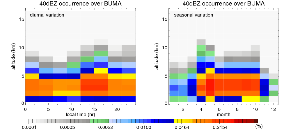 Here the precipitation means the precipitable hydrometeors (raindrops, snow flakes, graupel and hails) that detected by TRMM precipitation radar. Following figure shows the vertical profiles of 20, 30 and 40 dBZ fractional occurrence over BUMA in different seasons. The seasonal and diurnal variations of precipitation (20 dBZ) fractional occurrence at different altitudes are shown below: The seasonal and diurnal variations of INTENSIVE precipitation (40 dBZ) fractional occurrence at different altitudes are shown below: Clouds are consisted of small hydrometeors that undetectable by TRMM precipitation radar (Ku band). CloudSat (W band radar) provides the much great details of clouds. Following figure shows the vertical structure of the thin and thick clouds over BUMA. Note that high reflectivity at low levels are less frequent due to the attenuation. The seasonal variation of thin (-20 dBZ) and thick (0 dBZ) cloud over BUMA are shown below: |