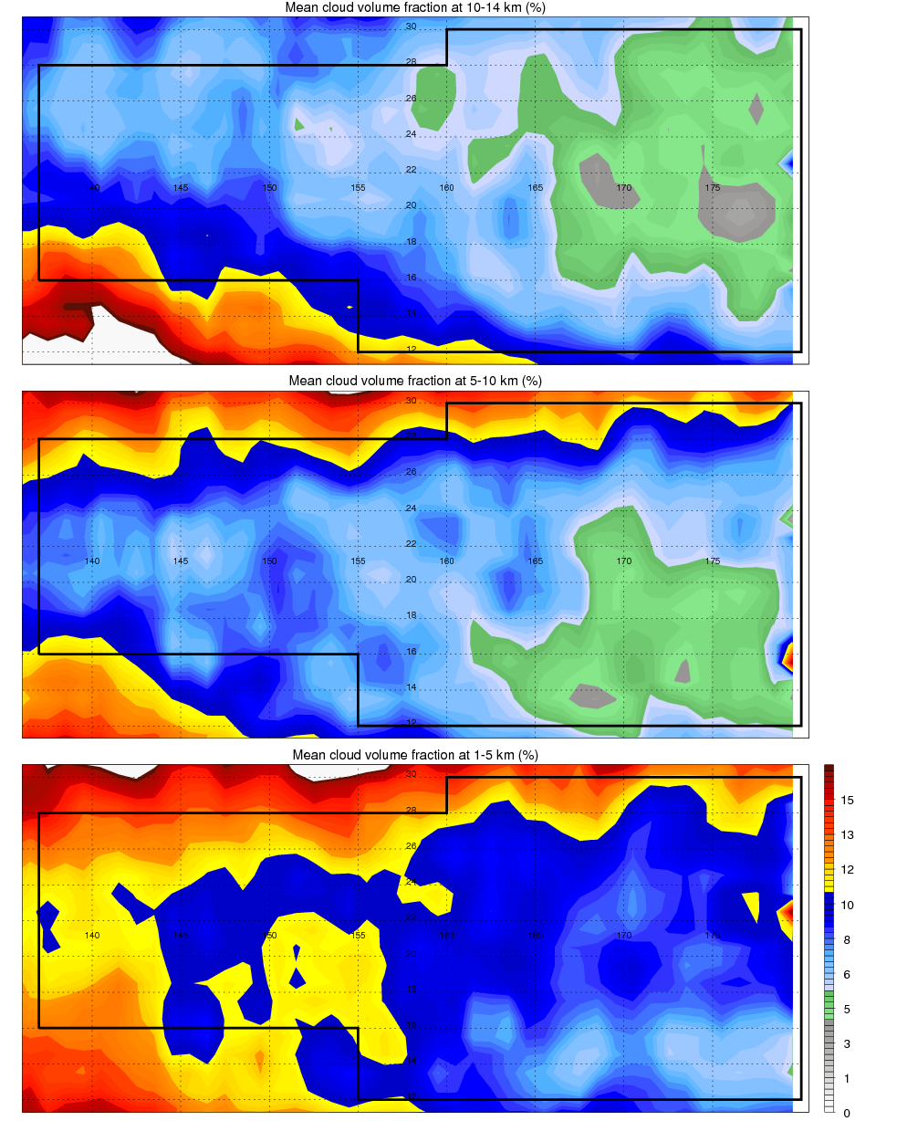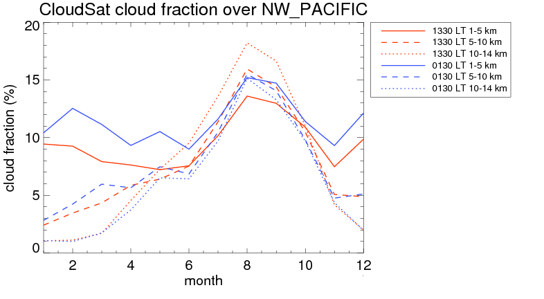 Over NW_PACIFIC , mean high level (10-14 km) cloud volume fraction is about 7.4%. Mean mid level (5-10 km) cloud volume fraction is about 8.0%. Mean low level (1-5 km) cloud volume fraction is about 10.4%. Seasonal and day vs. night variations of high, mid and low level cloud fraction over NW_PACIFIC are shown in following figure. You may check the details of cloud fraction in various seasons and at different local times. |
