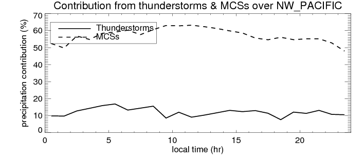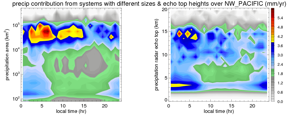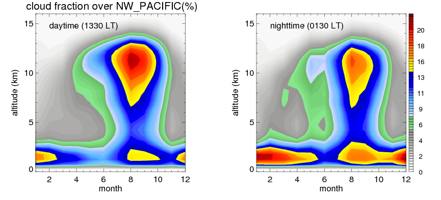 Many studies suggested that the diurnal variation of the precipitation is related to the life cycles of the precipitation systems, which is frequently driven by the surface sensible heating. Over NW_PACIFIC, mean annual precipitation are estimated with 927.1 (mm/year) from precipitation radar. Detailed diurnal variation of the precipitation at high resolution can be accessed here (NOTE: it may take long time to generate for a large area). The diurnal variation of precipitation from systems with different sizes and heights are shown below: In total, thunderstorms (systems with detected lightning flashes) contribute 12 %, MCSs (Mesoscale convective systems with raining area > 2000 km^2) contribute 57 % of all precipitation over NW_PACIFIC. Diurnal variations of fraction of precipitation from thunderstorms and MCSs over NW_PACIFIC are shown below: Certainly there is a strong diurnal variation of different types of clouds. Because CloudSat observes at 0130 and 1330 local time, here the daytime and night cloud fraction in different seasons are presented: |