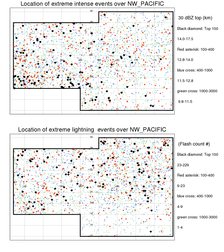 Following figure shows the location of the precipitation feautres categorized by the lightning rate and 30 dBZ echo top.