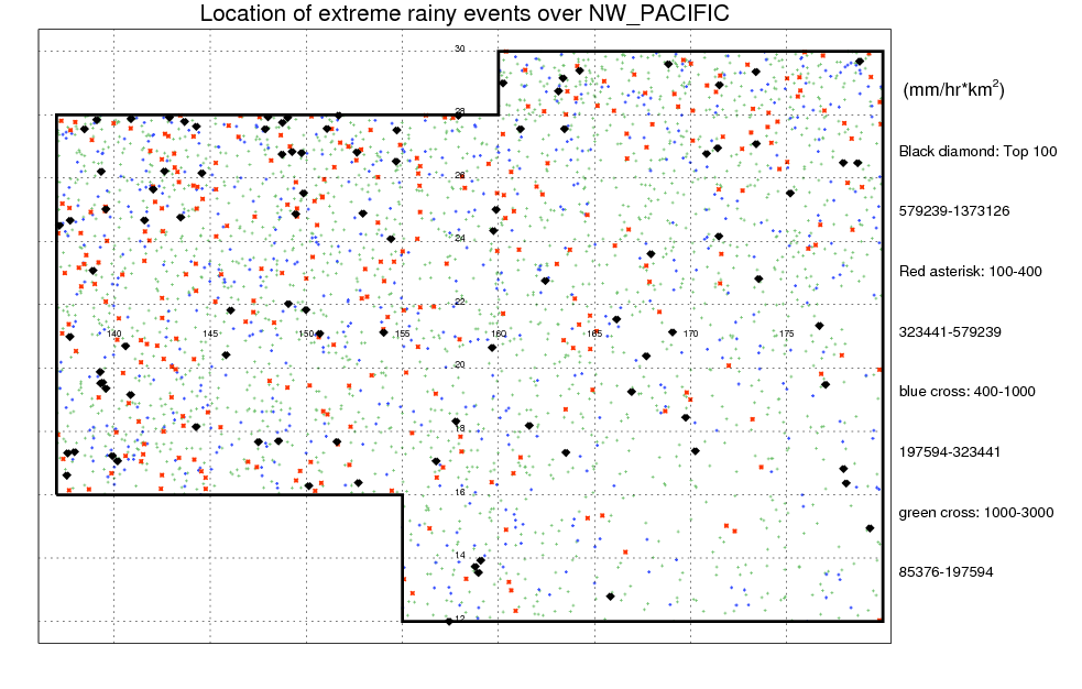 Following figure shows the location of the precipitation feautres categorized by the volumetric rainfall.