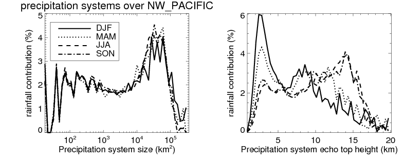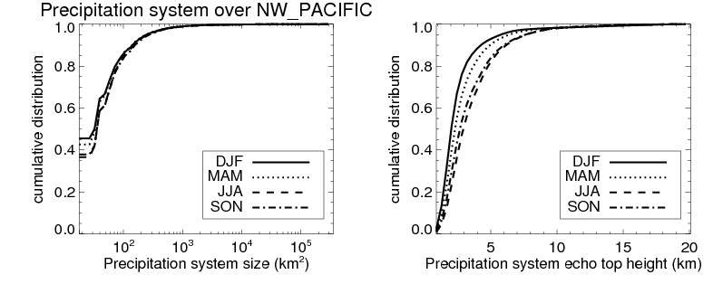 Over NW_PACIFIC , mean size of precipitation system about 151.0 (km^2) and mean maximum radar echo top height of these precipitation systems is about 3.6 km. Following figure shows the cumulative distribution of the sizes and depths of the precipitation systems in different seasons: Though usually there are more small systems, the larger systems would bring more total precipitation. |