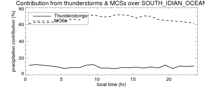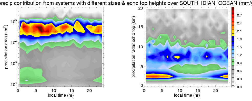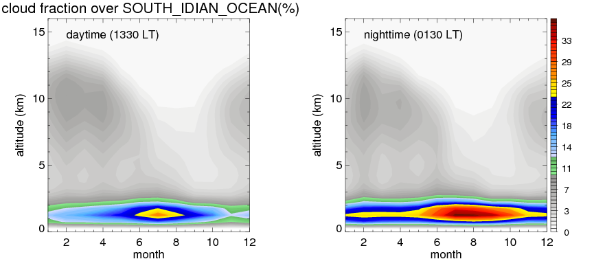 Many studies suggested that the diurnal variation of the precipitation is related to the life cycles of the precipitation systems, which is frequently driven by the surface sensible heating. Over SOUTH_IDIAN_OCEAN, mean annual precipitation are estimated with 416.4 (mm/year) from precipitation radar. Detailed diurnal variation of the precipitation at high resolution can be accessed here (NOTE: it may take long time to generate for a large area). The diurnal variation of precipitation from systems with different sizes and heights are shown below: In total, thunderstorms (systems with detected lightning flashes) contribute 9 %, MCSs (Mesoscale convective systems with raining area > 2000 km^2) contribute 66 % of all precipitation over SOUTH_IDIAN_OCEAN. Diurnal variations of fraction of precipitation from thunderstorms and MCSs over SOUTH_IDIAN_OCEAN are shown below: Certainly there is a strong diurnal variation of different types of clouds. Because CloudSat observes at 0130 and 1330 local time, here the daytime and night cloud fraction in different seasons are presented: |