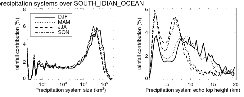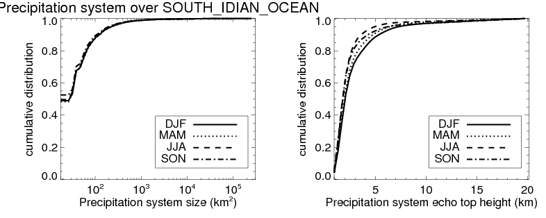 Over SOUTH_IDIAN_OCEAN , mean size of precipitation system about 151.9 (km^2) and mean maximum radar echo top height of these precipitation systems is about 2.9 km. Following figure shows the cumulative distribution of the sizes and depths of the precipitation systems in different seasons: Though usually there are more small systems, the larger systems would bring more total precipitation. |