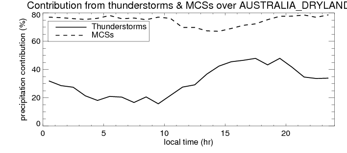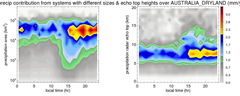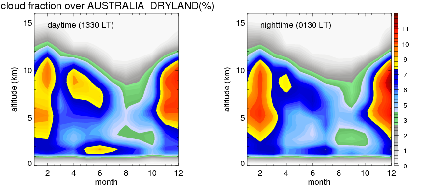 Many studies suggested that the diurnal variation of the precipitation is related to the life cycles of the precipitation systems, which is frequently driven by the surface sensible heating. Over AUSTRALIA_DRYLAND, mean annual precipitation are estimated with 366.0 (mm/year) from precipitation radar. Detailed diurnal variation of the precipitation at high resolution can be accessed here (NOTE: it may take long time to generate for a large area). The diurnal variation of precipitation from systems with different sizes and heights are shown below: In total, thunderstorms (systems with detected lightning flashes) contribute 33 %, MCSs (Mesoscale convective systems with raining area > 2000 km^2) contribute 74 % of all precipitation over AUSTRALIA_DRYLAND. Diurnal variations of fraction of precipitation from thunderstorms and MCSs over AUSTRALIA_DRYLAND are shown below: Certainly there is a strong diurnal variation of different types of clouds. Because CloudSat observes at 0130 and 1330 local time, here the daytime and night cloud fraction in different seasons are presented: |