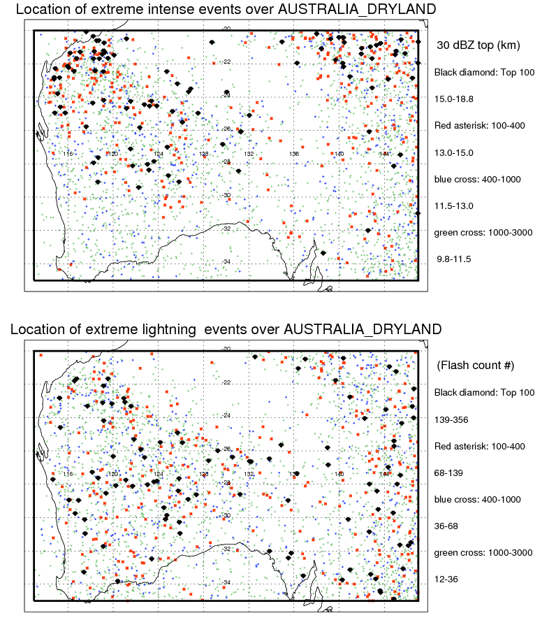 Following figure shows the location of the precipitation feautres categorized by the lightning rate and 30 dBZ echo top.