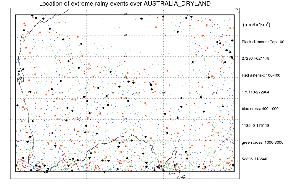 Following figure shows the location of the precipitation feautres categorized by the volumetric rainfall.