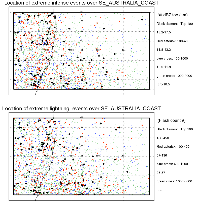 Following figure shows the location of the precipitation feautres categorized by the lightning rate and 30 dBZ echo top.