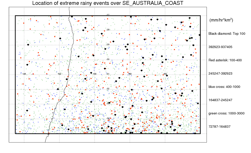 Following figure shows the location of the precipitation feautres categorized by the volumetric rainfall.