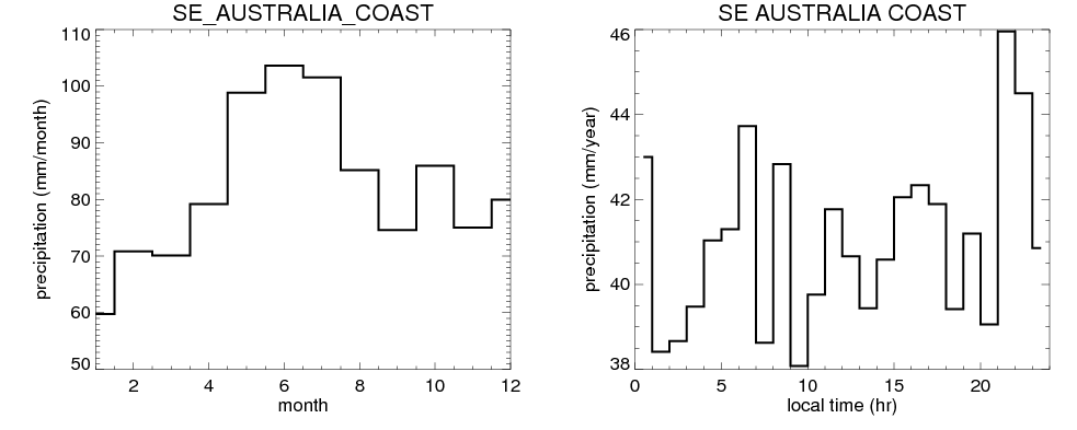 Over SE_AUSTRALIA_COAST , mean annual precipitation are estimated with 984.6 (mm/year) from precipitation radar, and 887.3 (mm/year) from microwave radiometer observations. (see high resolution precipitation product , NOTE: it may take long time to generate for large area) In total, thunderstorms (systems with detected lightning flashes) contribute 29 %, MCSs (Mesoscale convective systems with raining area > 2000 km^2) contribute 76 % of all precipitation. Seasonal and diurnal variations of rainfall over SE_AUSTRALIA_COAST are shown in following figure. You may check the details of rainfall contributions from precipitation systems with different sizes and intensities in various seasons and at different local times. |