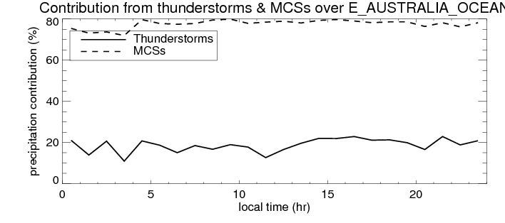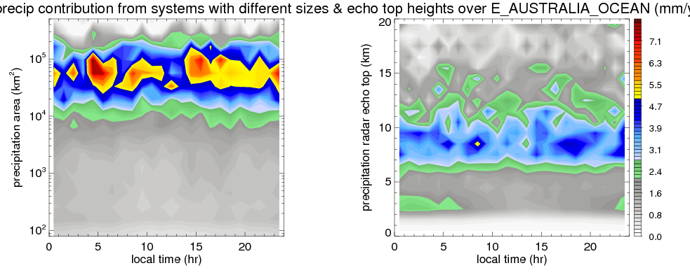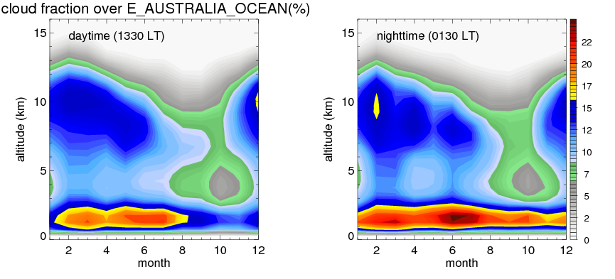 Many studies suggested that the diurnal variation of the precipitation is related to the life cycles of the precipitation systems, which is frequently driven by the surface sensible heating. Over E_AUSTRALIA_OCEAN, mean annual precipitation are estimated with 915.7 (mm/year) from precipitation radar. Detailed diurnal variation of the precipitation at high resolution can be accessed here (NOTE: it may take long time to generate for a large area). The diurnal variation of precipitation from systems with different sizes and heights are shown below: In total, thunderstorms (systems with detected lightning flashes) contribute 18 %, MCSs (Mesoscale convective systems with raining area > 2000 km^2) contribute 77 % of all precipitation over E_AUSTRALIA_OCEAN. Diurnal variations of fraction of precipitation from thunderstorms and MCSs over E_AUSTRALIA_OCEAN are shown below: Certainly there is a strong diurnal variation of different types of clouds. Because CloudSat observes at 0130 and 1330 local time, here the daytime and night cloud fraction in different seasons are presented: |