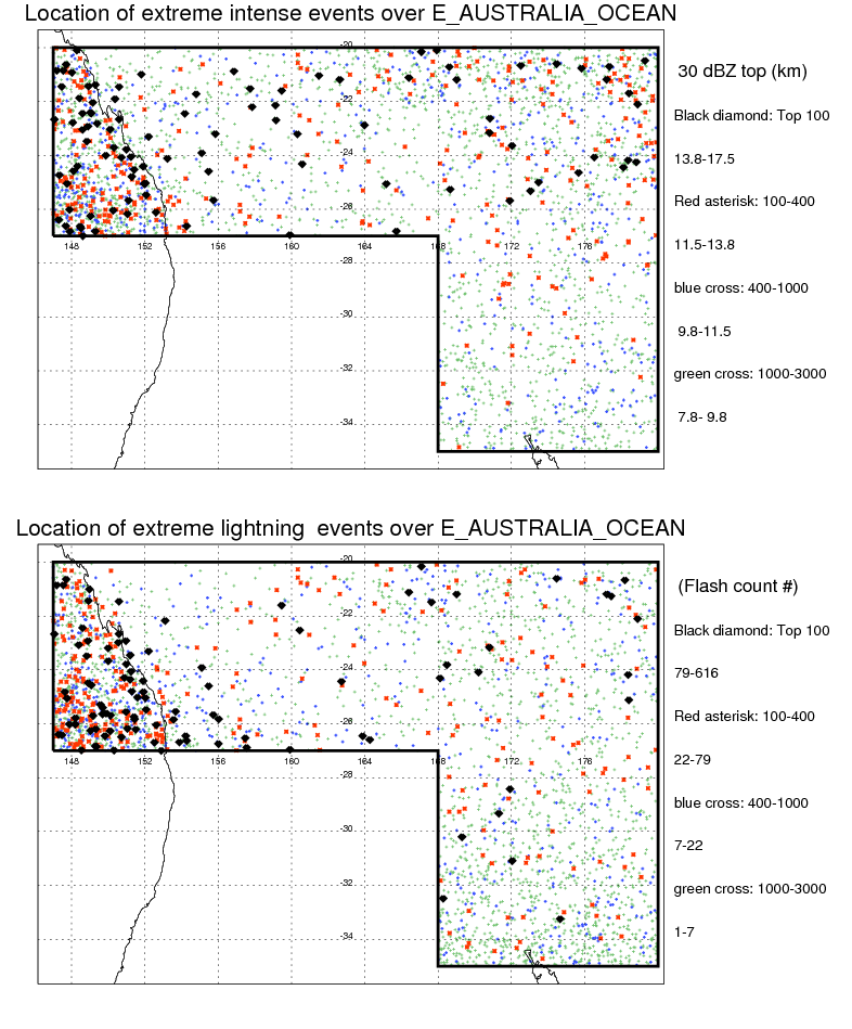 Following figure shows the location of the precipitation feautres categorized by the lightning rate and 30 dBZ echo top.