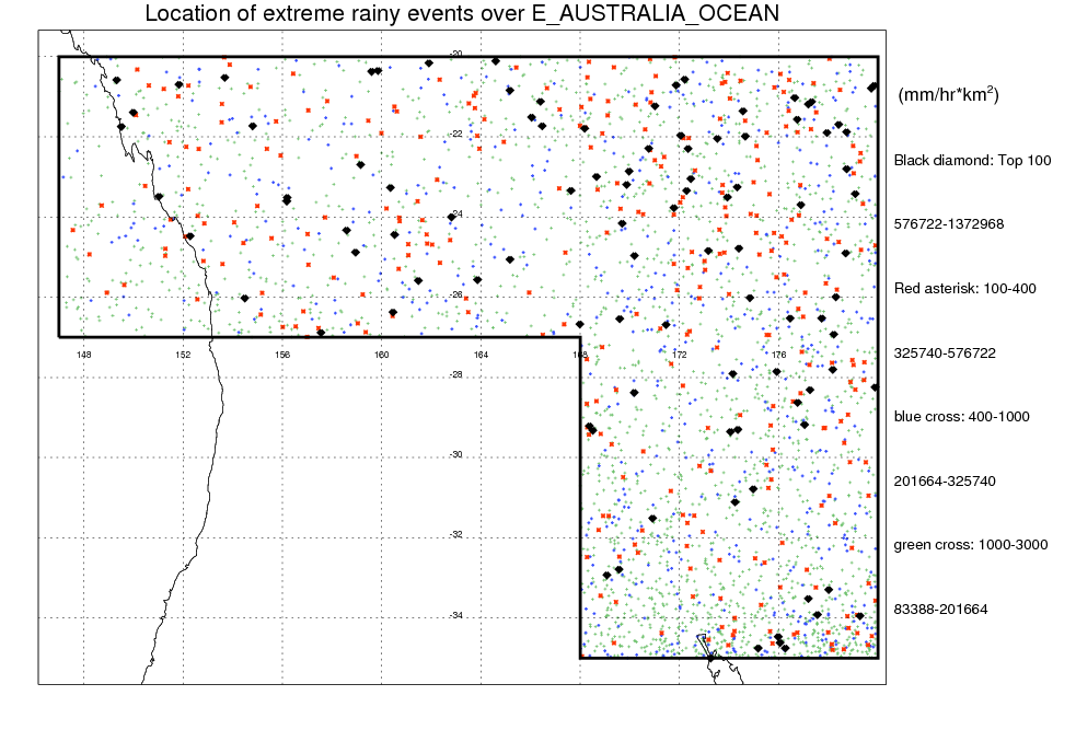 Following figure shows the location of the precipitation feautres categorized by the volumetric rainfall.