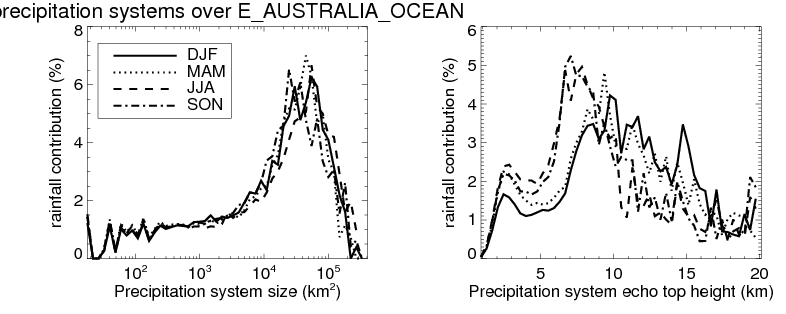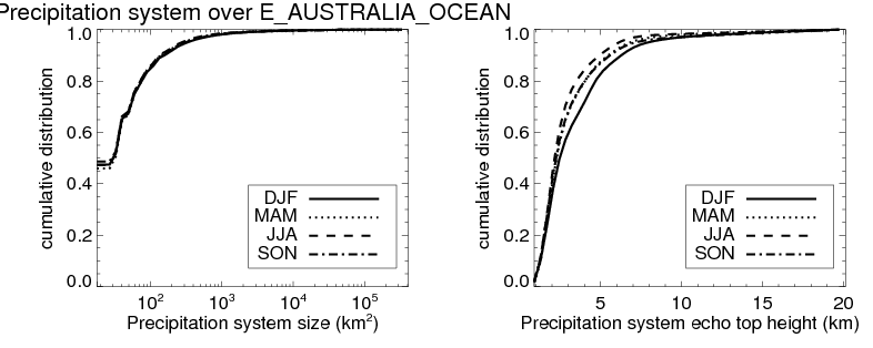 Over E_AUSTRALIA_OCEAN , mean size of precipitation system about 245.8 (km^2) and mean maximum radar echo top height of these precipitation systems is about 3.4 km. Following figure shows the cumulative distribution of the sizes and depths of the precipitation systems in different seasons: Though usually there are more small systems, the larger systems would bring more total precipitation. |