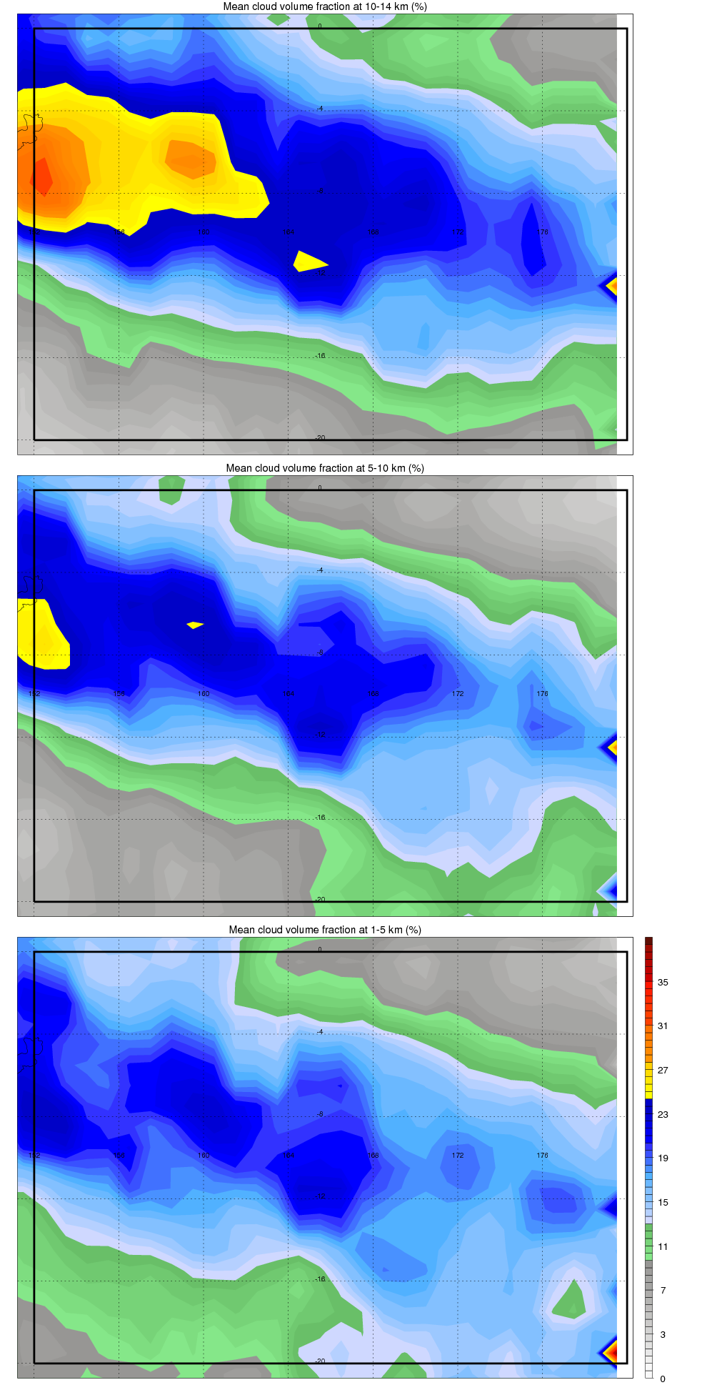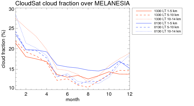 Over MELANESIA , mean high level (10-14 km) cloud volume fraction is about 17.1%. Mean mid level (5-10 km) cloud volume fraction is about 15.0%. Mean low level (1-5 km) cloud volume fraction is about 15.8%. Seasonal and day vs. night variations of high, mid and low level cloud fraction over MELANESIA are shown in following figure. You may check the details of cloud fraction in various seasons and at different local times. |