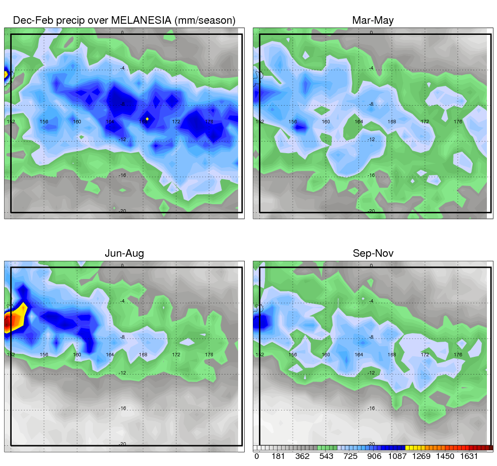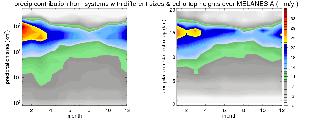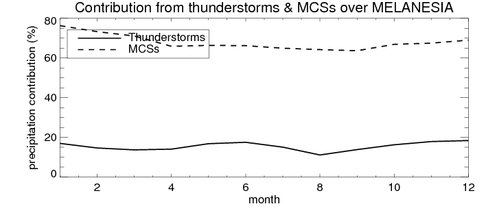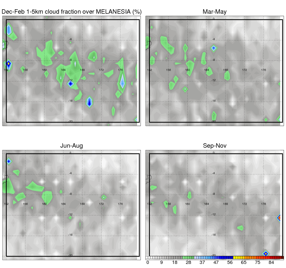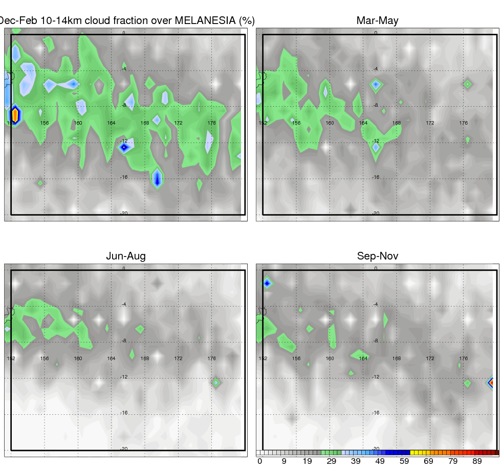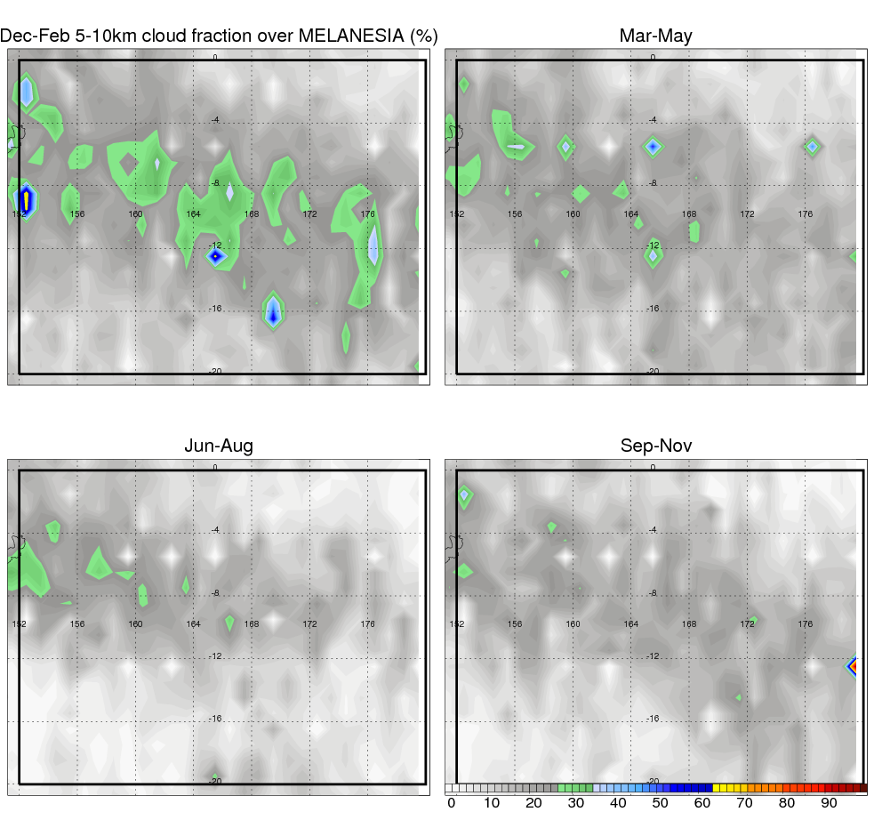 Over MELANESIA , mean annual precipitation are estimated with 2133.5 (mm/year) from TRMM precipitation radar. (distribution of precipitation see here ) Total surface rainfall is brought by various precipitation systems. The seasonal variation of precipitation from systems with different sizes and heights are shown below: In total, thunderstorms (systems with detected lightning flashes) contribute 15 %, MCSs (Mesoscale convective systems with raining area > 2000 km^2) contribute 68 % of all precipitation. Seasonal variations of fraction of precipitation from thunderstorms and MCSs are shown below: The seasonal variation of geographical distribution of CloudSat cloud fraction over MELANESIA is shown below: The seasonal variation of mean CloudSat level cloud fraction at different altitudes over MELANESIA is shown below: |