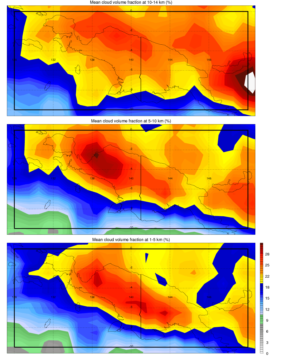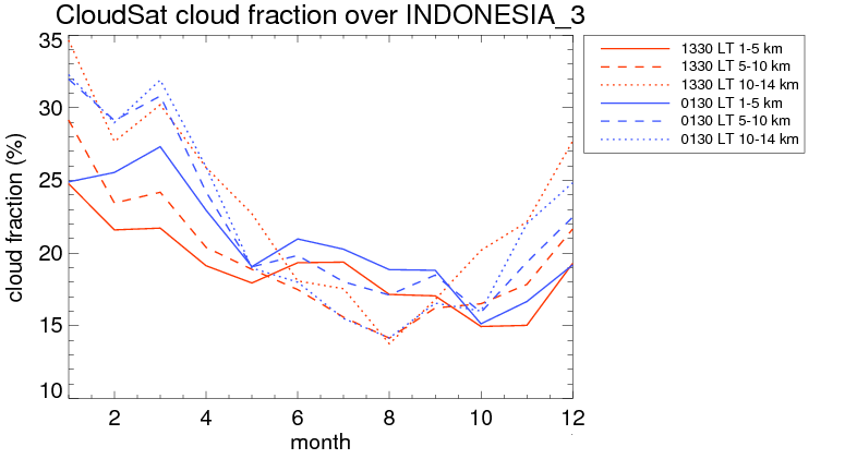 Over INDONESIA_3 , mean high level (10-14 km) cloud volume fraction is about 22.3%. Mean mid level (5-10 km) cloud volume fraction is about 20.3%. Mean low level (1-5 km) cloud volume fraction is about 19.5%. Seasonal and day vs. night variations of high, mid and low level cloud fraction over INDONESIA_3 are shown in following figure. You may check the details of cloud fraction in various seasons and at different local times. |