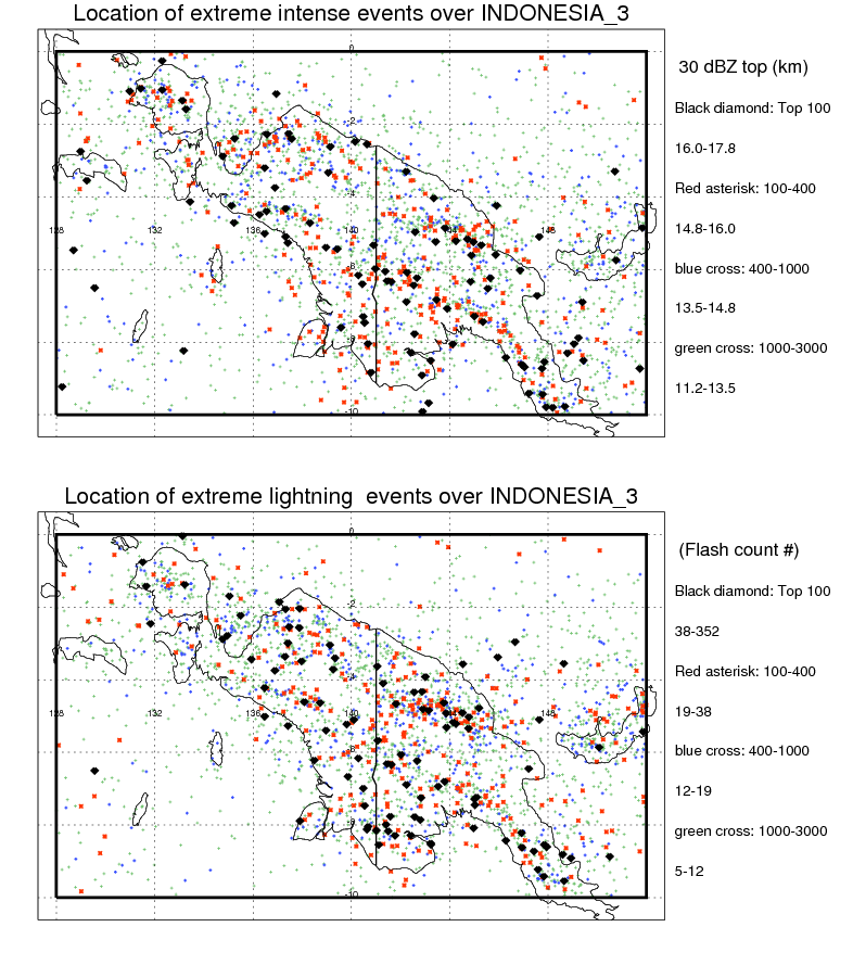 Following figure shows the location of the precipitation feautres categorized by the lightning rate and 30 dBZ echo top.