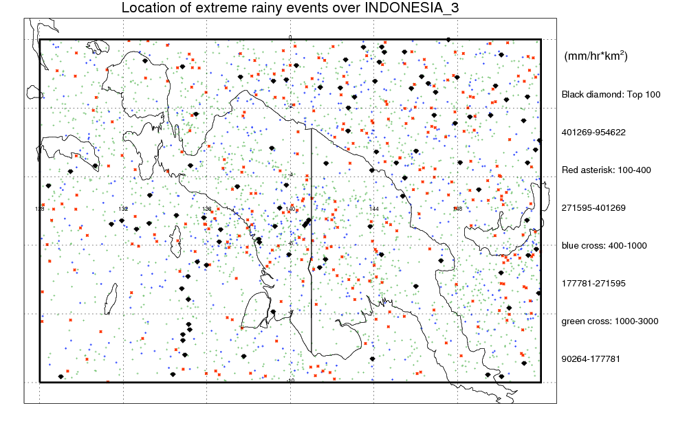 Following figure shows the location of the precipitation feautres categorized by the volumetric rainfall.