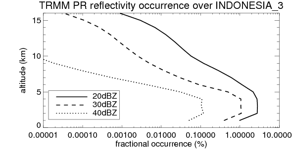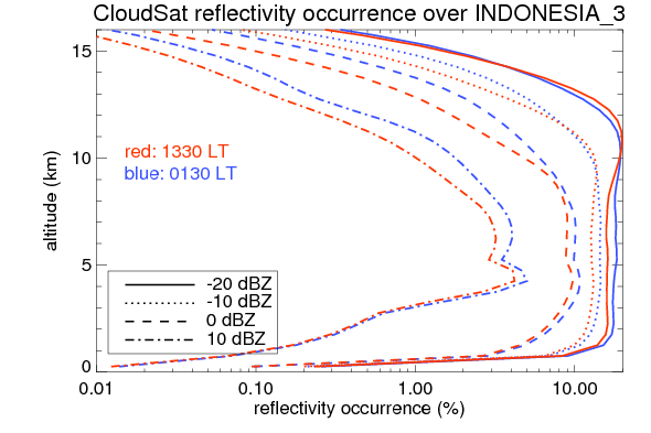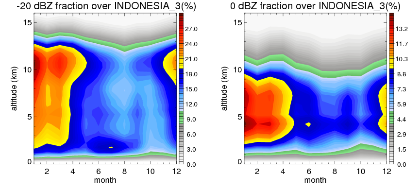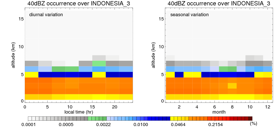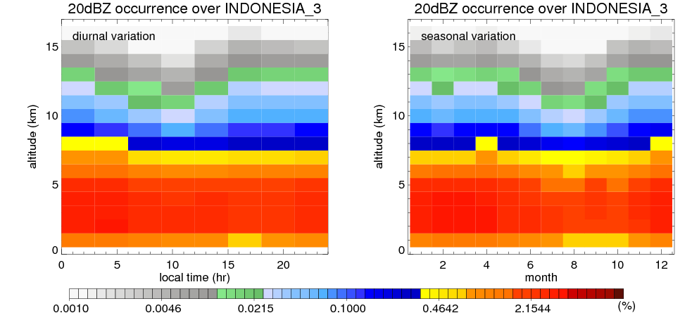 Here the precipitation means the precipitable hydrometeors (raindrops, snow flakes, graupel and hails) that detected by TRMM precipitation radar. Following figure shows the vertical profiles of 20, 30 and 40 dBZ fractional occurrence over INDONESIA_3 in different seasons. The seasonal and diurnal variations of precipitation (20 dBZ) fractional occurrence at different altitudes are shown below: The seasonal and diurnal variations of INTENSIVE precipitation (40 dBZ) fractional occurrence at different altitudes are shown below: Clouds are consisted of small hydrometeors that undetectable by TRMM precipitation radar (Ku band). CloudSat (W band radar) provides the much great details of clouds. Following figure shows the vertical structure of the thin and thick clouds over INDONESIA_3. Note that high reflectivity at low levels are less frequent due to the attenuation. The seasonal variation of thin (-20 dBZ) and thick (0 dBZ) cloud over INDONESIA_3 are shown below: |